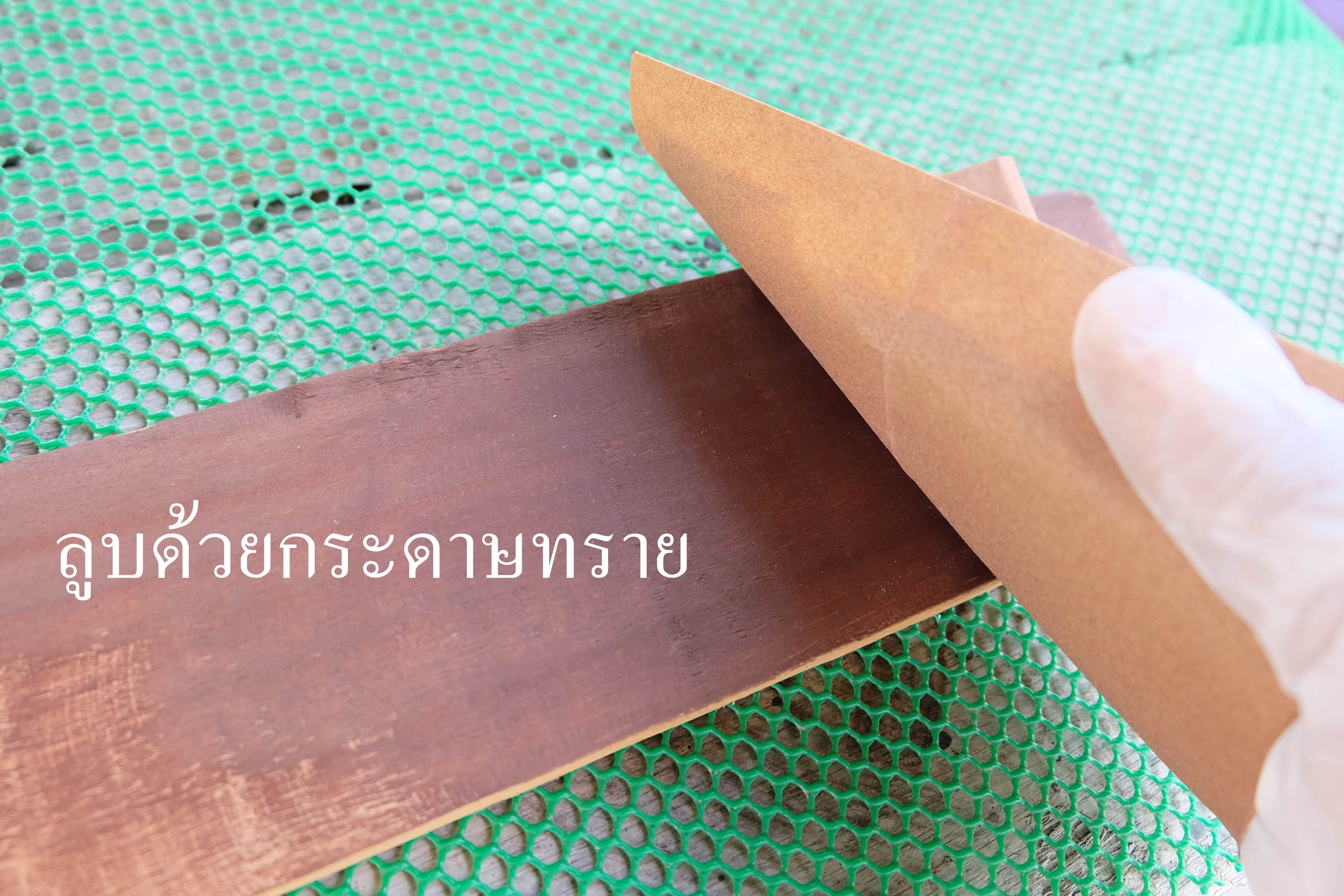 รอสีแห้ง ลูบด้วยกระดาษทรายเบอร์ 0 เบา ๆ จะเห็นเนื้อไม้บางส่วน ขั้นตอนนี้ไม่ลูบก็ไม่มีปัญหา