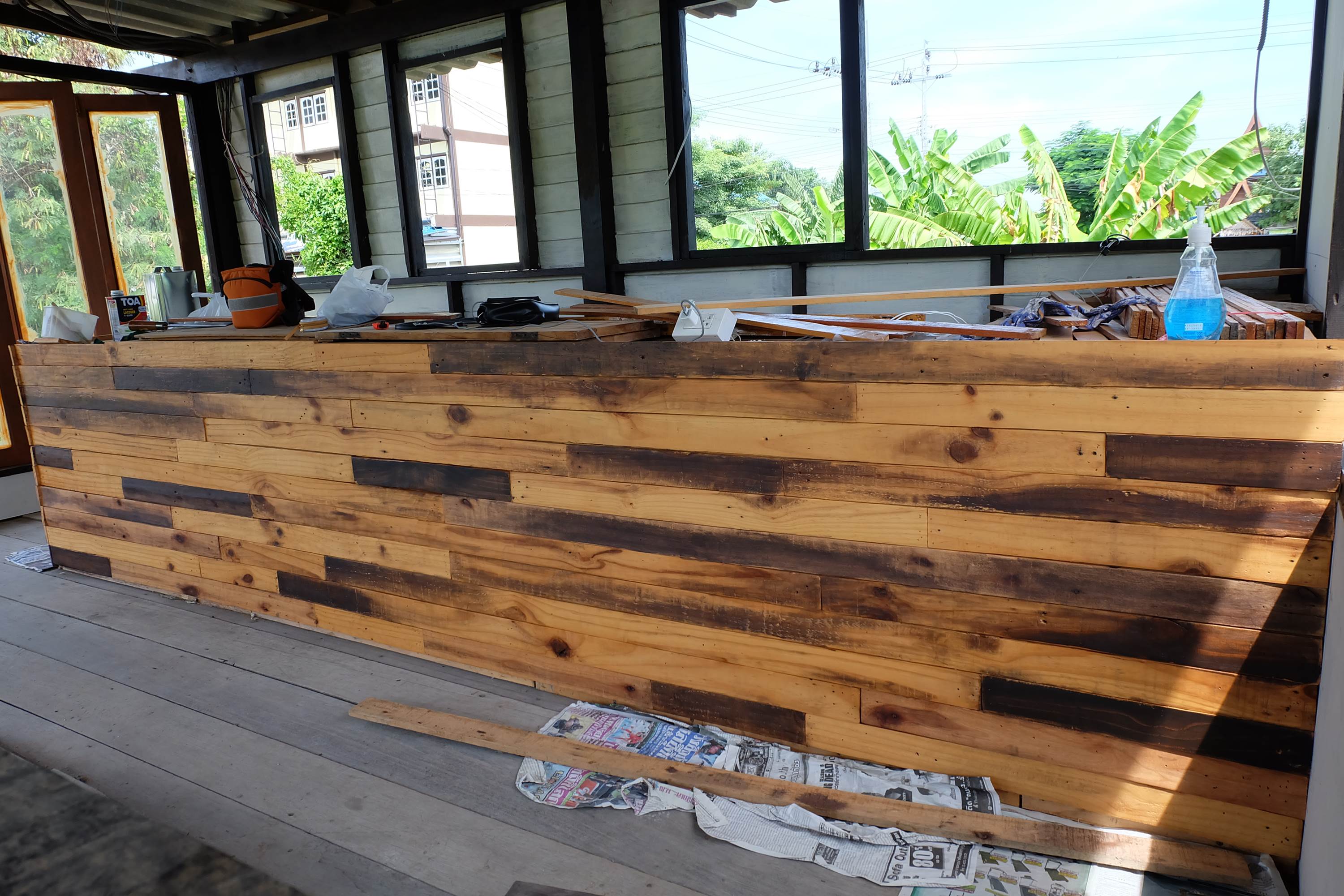 ก็เอามาให้ช่างดู ว่าอยากได้สีแบบนี้ ไม้พาเลทขาวไปหน่อย อยากได้สีเข้ม ๆ ทำไงได้บ้าง เพราะช่างแปะไม้ไปแล้วตามรูป