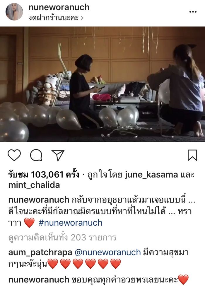 โดยสาวนุ่น ได้โพสต์คลิปวิดีโอ ตอนเพื่อน ๆ กำลังช่วยกันจัดปาร์ตี้เซอร์ไพรส์ให้ พร้อมข้อความว่า "กลับจากอยุธยาแล้วมาเจอแบบนี้ ... ดีใจนะคะที่มีกัลยาณมิตรแบบที่หาที่ไหนไม่ได้"