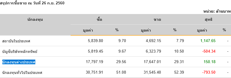 Sinthorn Summary 26/9/2560 : ต่างชาติซื้อสุทธิ 150.18 ลบ