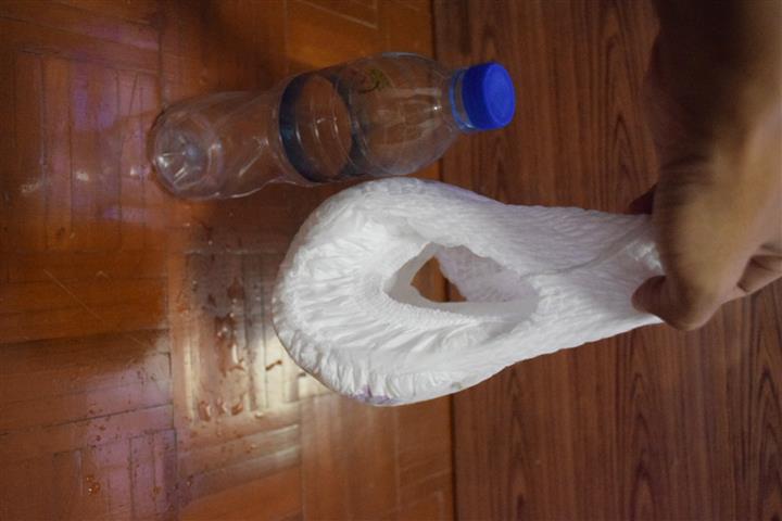 2. ทดสอบความจุของผ้าอ้อม =>> จุน้ำได้ประมาณ 600 ml.