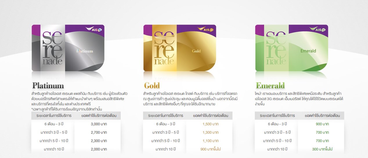 ตอนนี้ใช้ Ais มาเป็นเวลา 7 ปีกว่าๆ ใช้แพคเกจค่าบริการรวมจ่ายต่อเดือน เกือบ 1,200 บาท รับสิทธิ์ serenade emerald อยู่ครับ แต่รู้สึกว่าไม่มีประโยชน์อะไรเลย อีกหนึ่งหมายเลขของคุณพ่อ ใช้ Ais มาเป็นเวลา