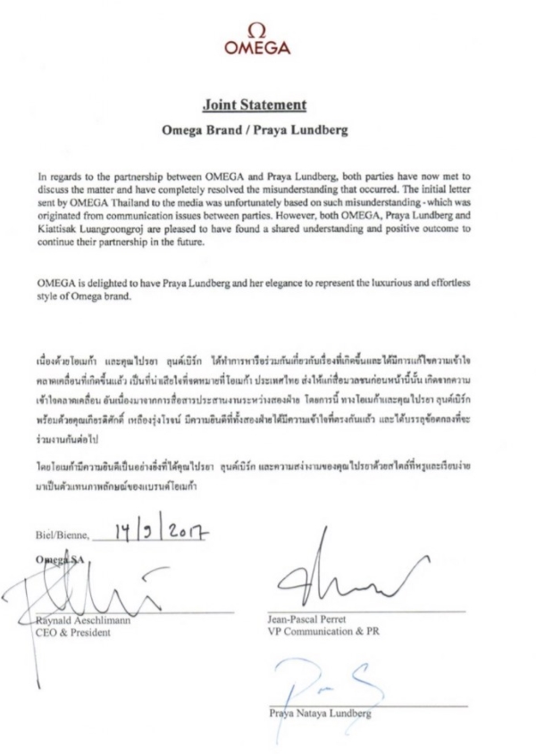 หลังจากก่อนหน้านี้ทาง “โอเมก้า” ได้ร่อนจดหมายถึงสื่อ โดยเนื้อหาใจความนั้น คือได้ ปลด นางเอกสาว “ปู”ไปรยา ลุนด์เบิร์ก จากการเป็นตำแหน่ง FRIEND OF OMEGA เมื่อช่วงเดือนมิถุนายน ล่าสุดวันนี้ (29 ก.ย.) ทาง โอเมก้า ได้มีจดหมายถึงสื่ออีกครั้ง เพื่อประกาศให้ทราบว่า หลังจากมีการพูดคุยกับทาง "ปู"ไปรยา ล่าสุดได้กลับมาร่วมงานกันอีกครั้ง