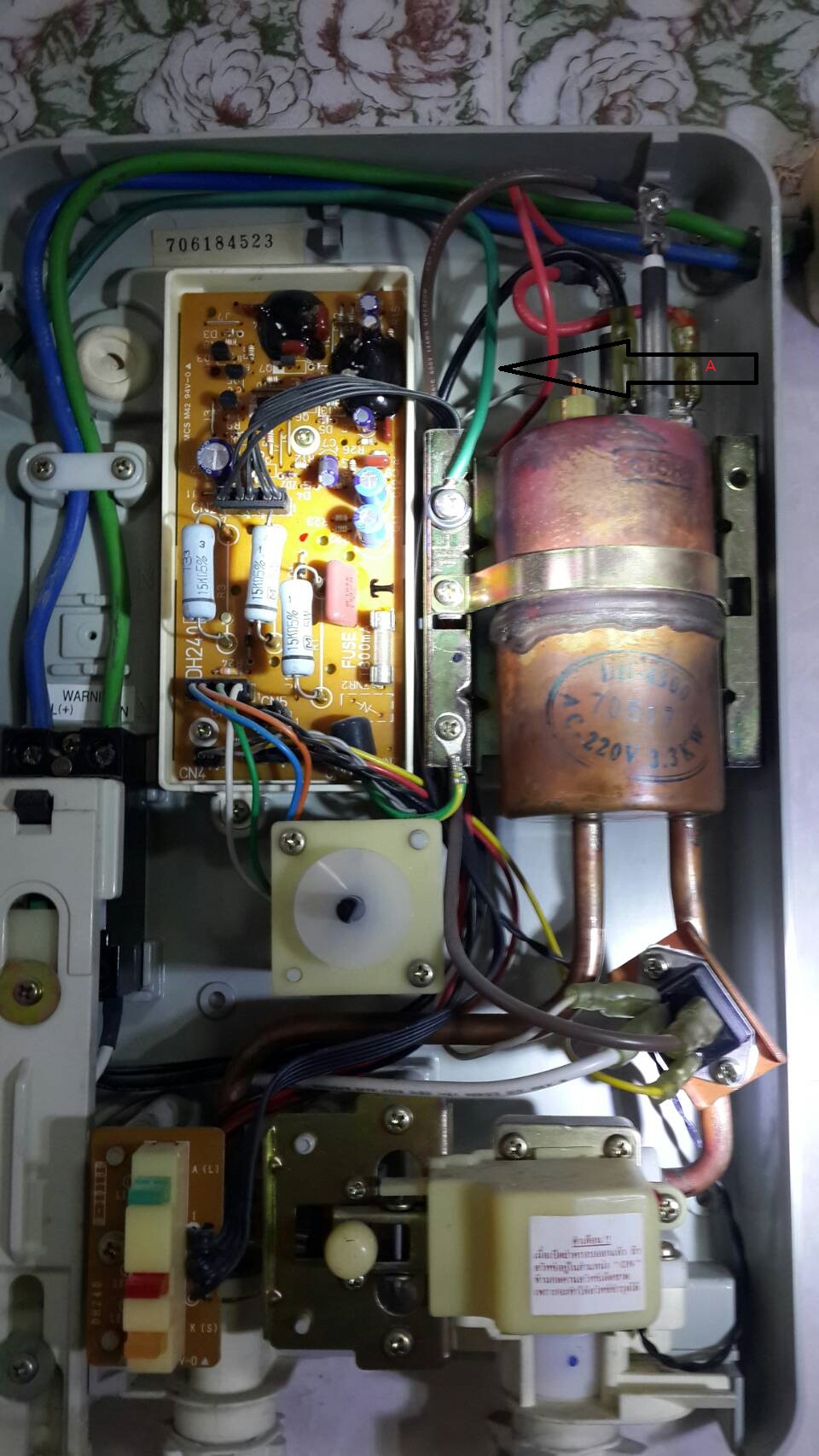เพื่อนฝากถาม ต่อสายดินเครื่องทำน้ำอุ่น โดยใช้สายสีเขียวA (ลูกศร A)