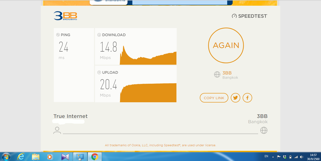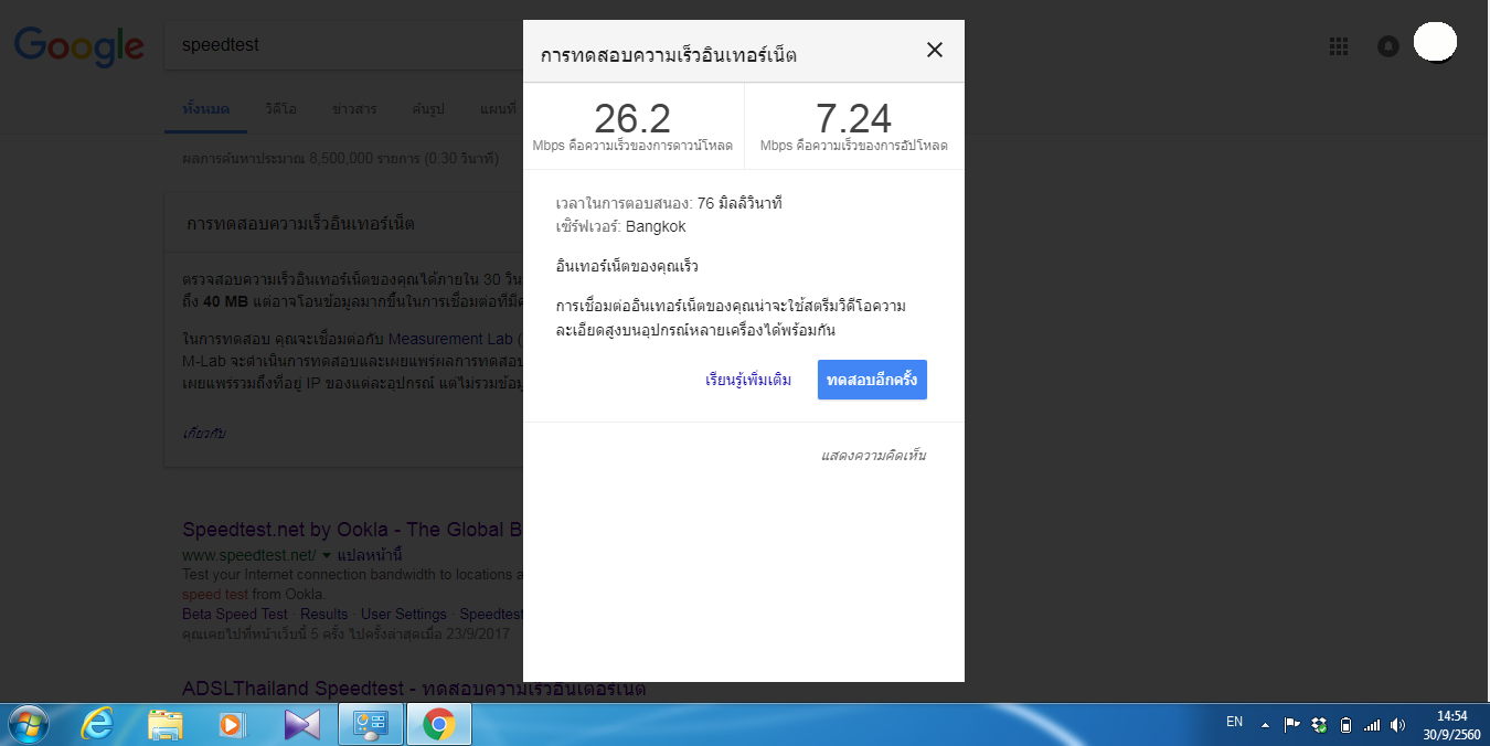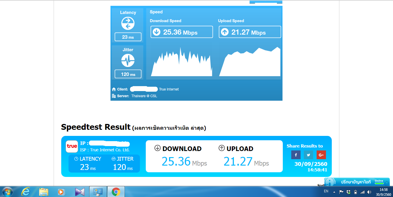 จึงทำการ Test Speed Internet (ความเร็วตามแพคเกจคือ Download 50MB Upload 20MB) แล้วพบว่า