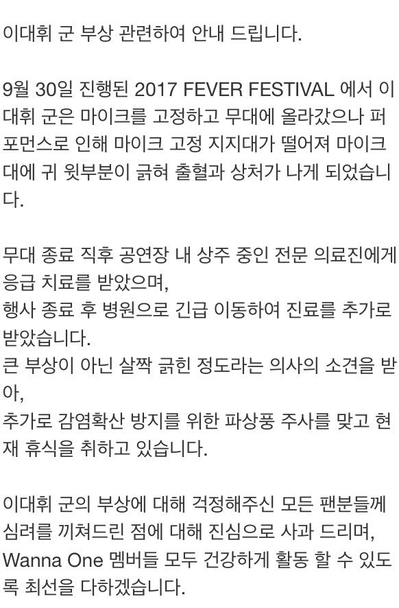 Article: [Official] Wanna One's Lee Daehwi rushed to hospital for ear injury