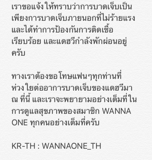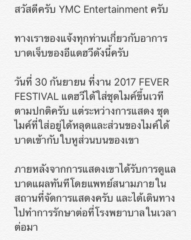 EDIT แก้ไขข้อมูลเรื่องสาเหตุการบาดเจ็บค่ะ วันนี้น้องไปงานแจกลายเซ็นและน่าจะเป็นบาดแผลภายนอกเล็กน้อยค่ะ