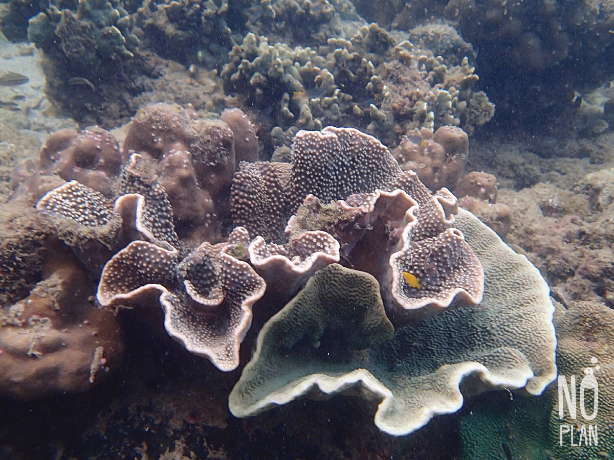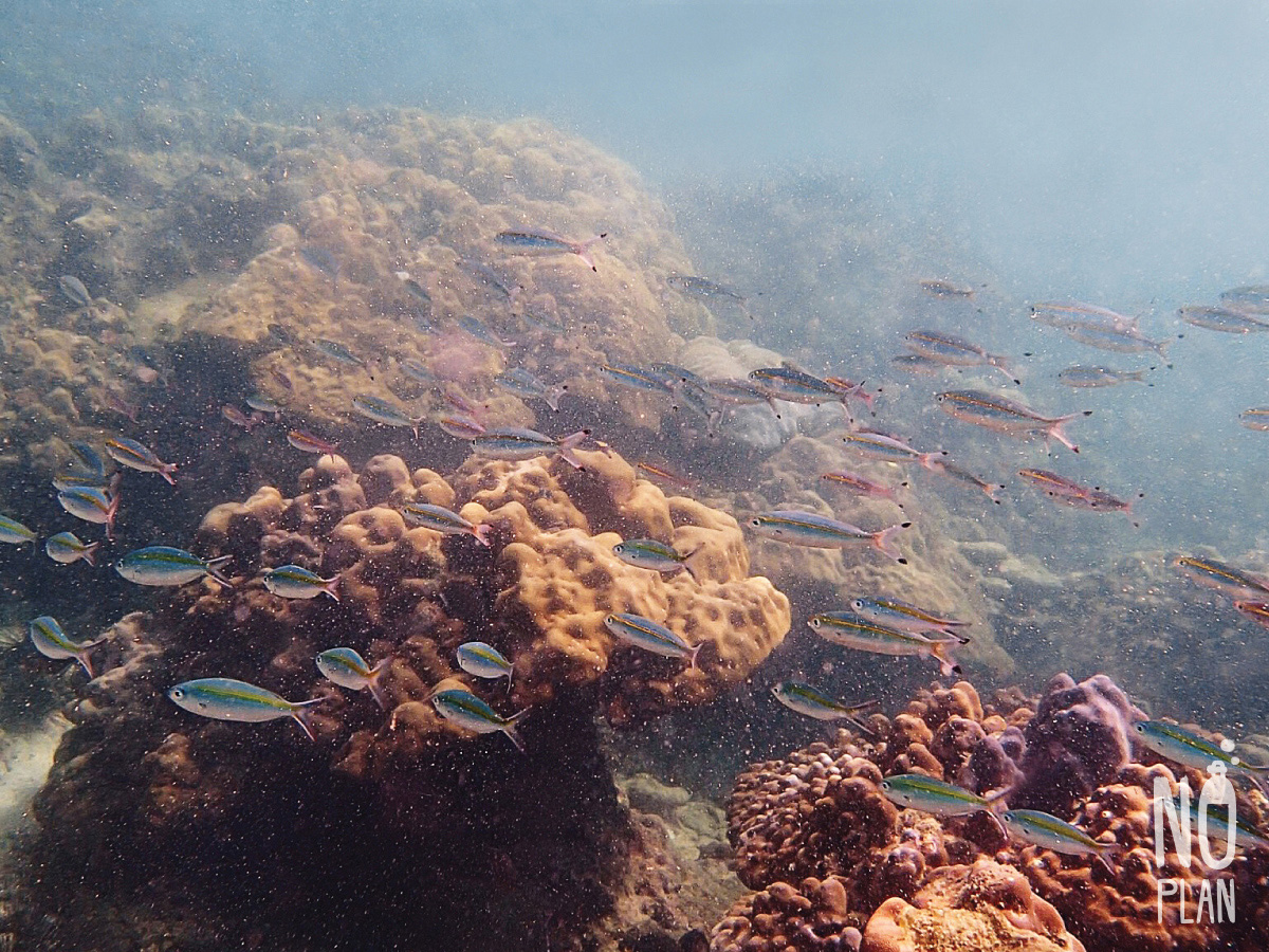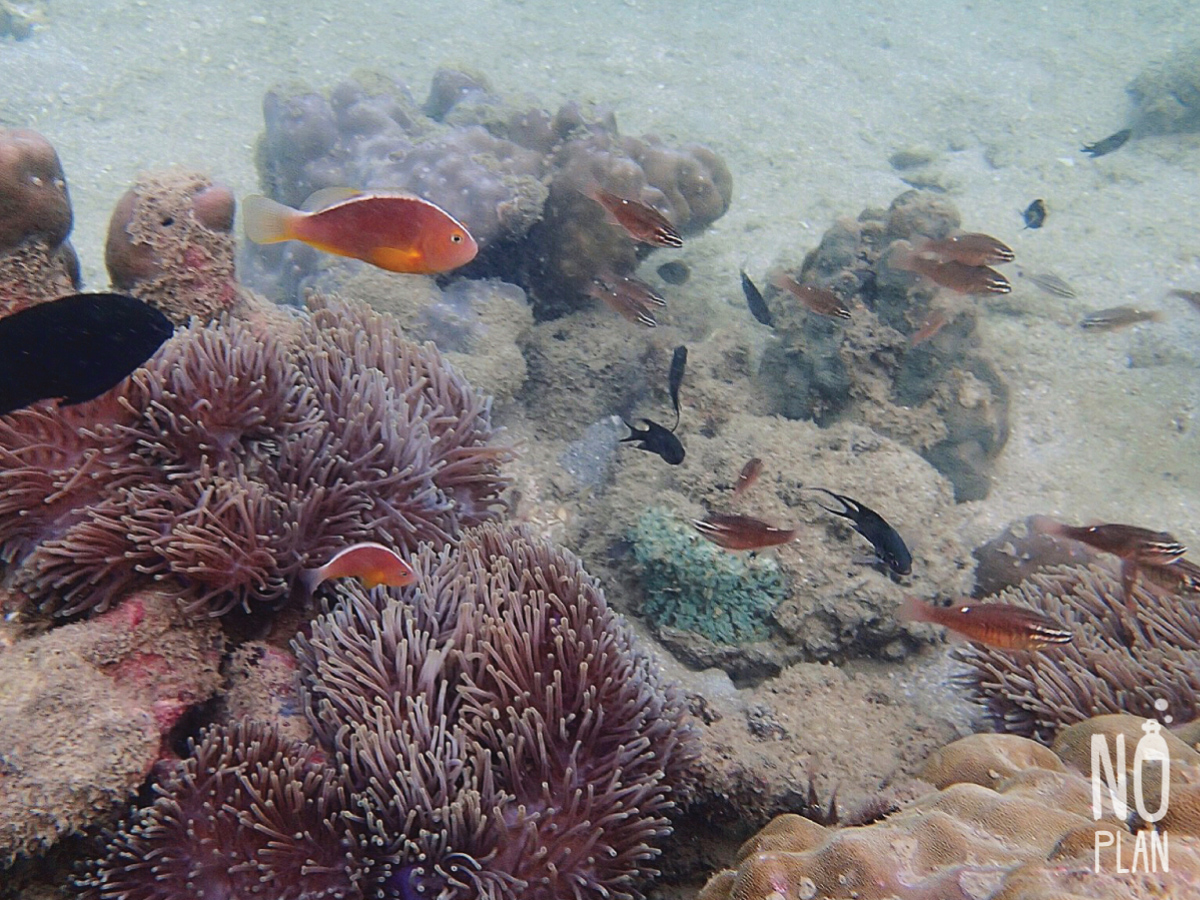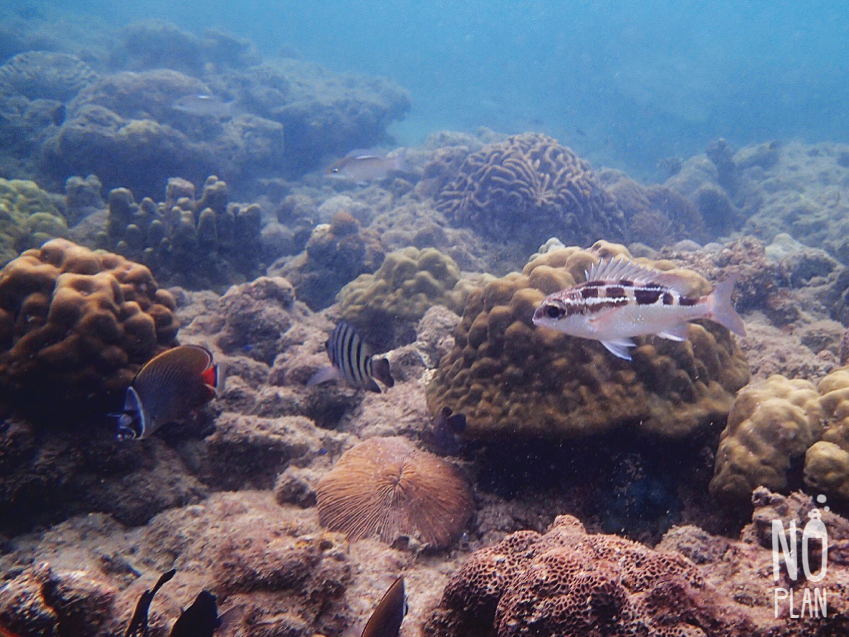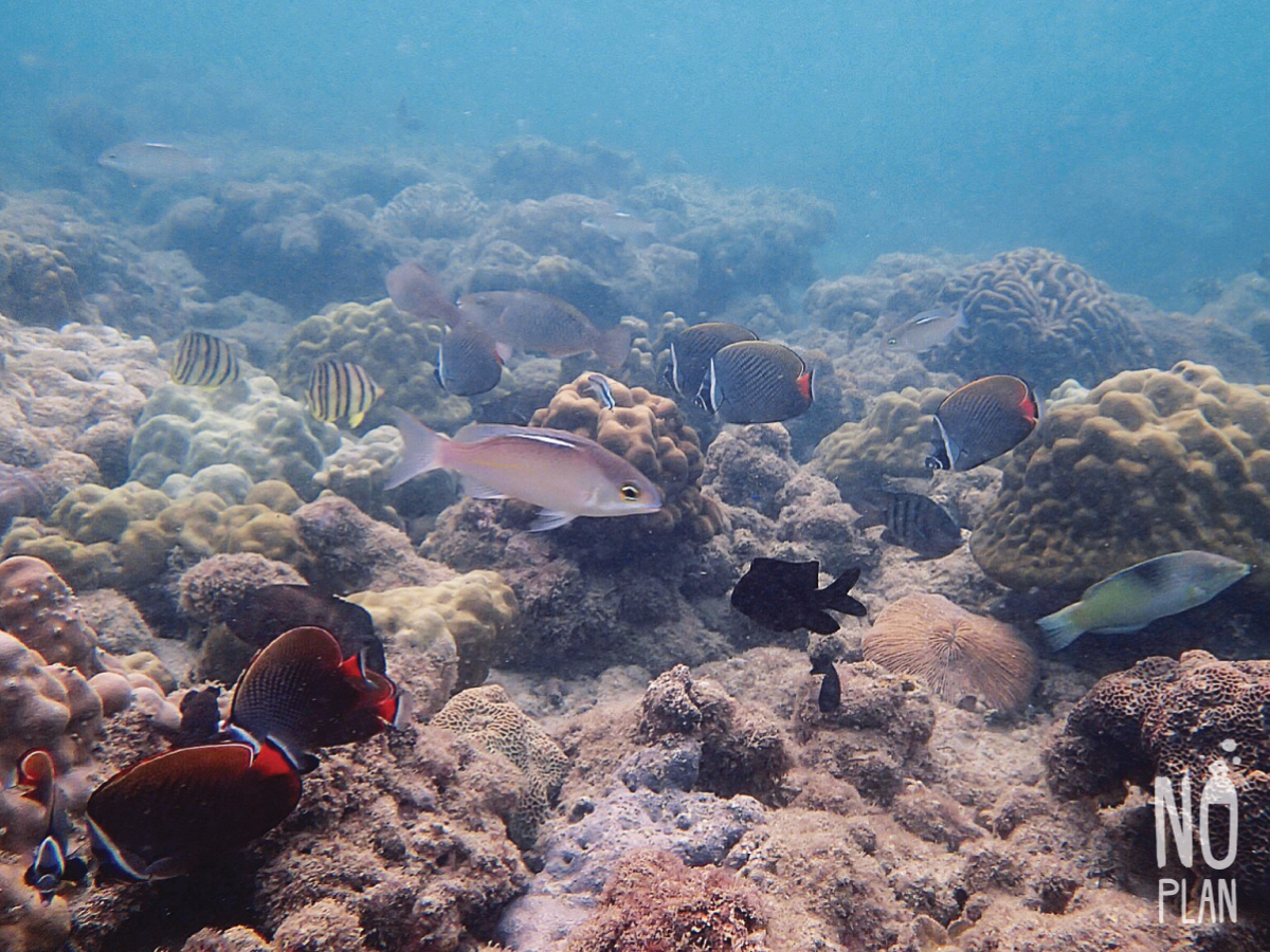 จุดดำน้ำที่นี่ส่วนใหญ่เป็นปะการังโขดหิน กับฝูงปลาตัวเล็กๆเยอะ ไม่หลากหลายเท่าหน้าหาดเรานะ
