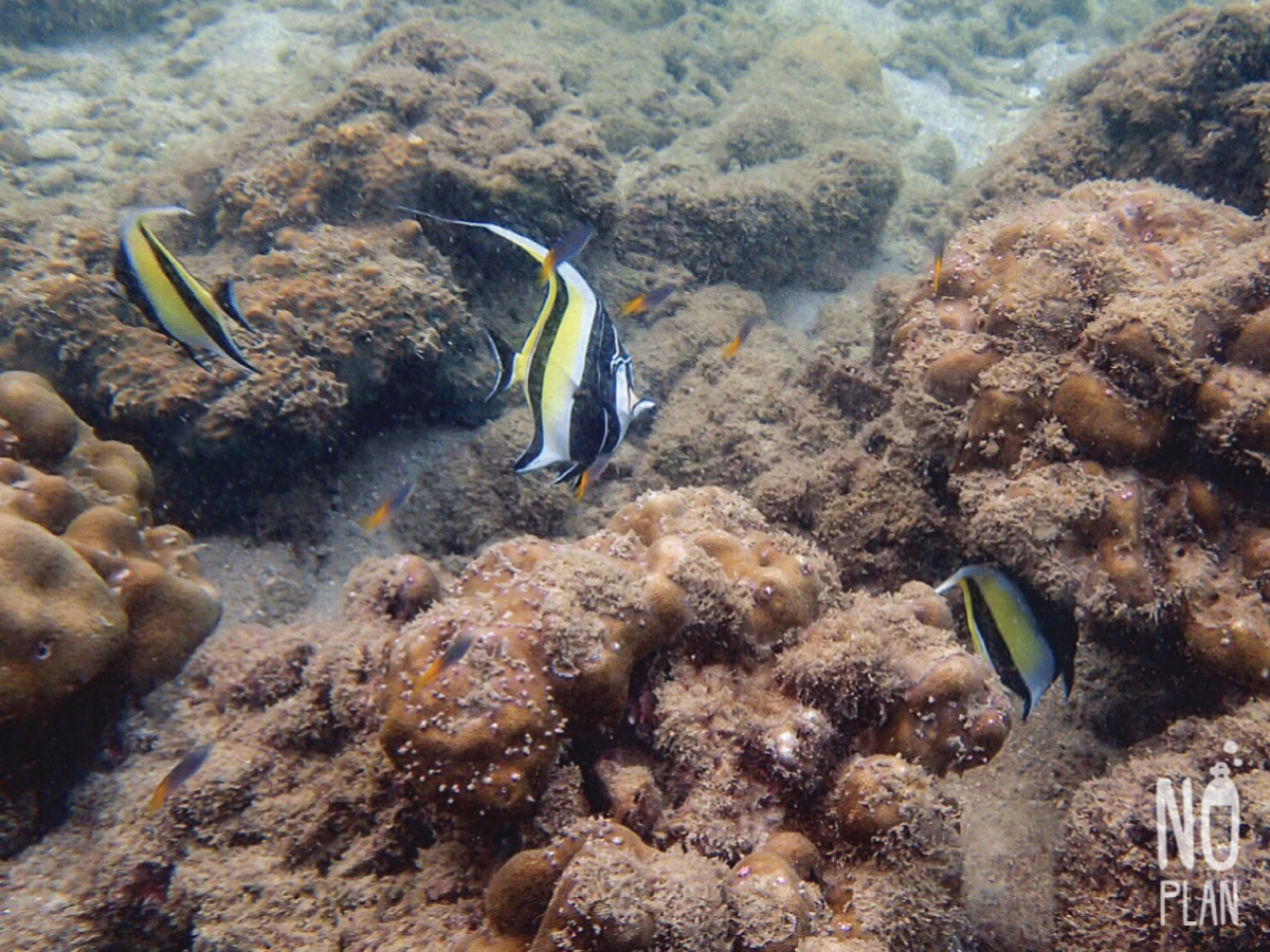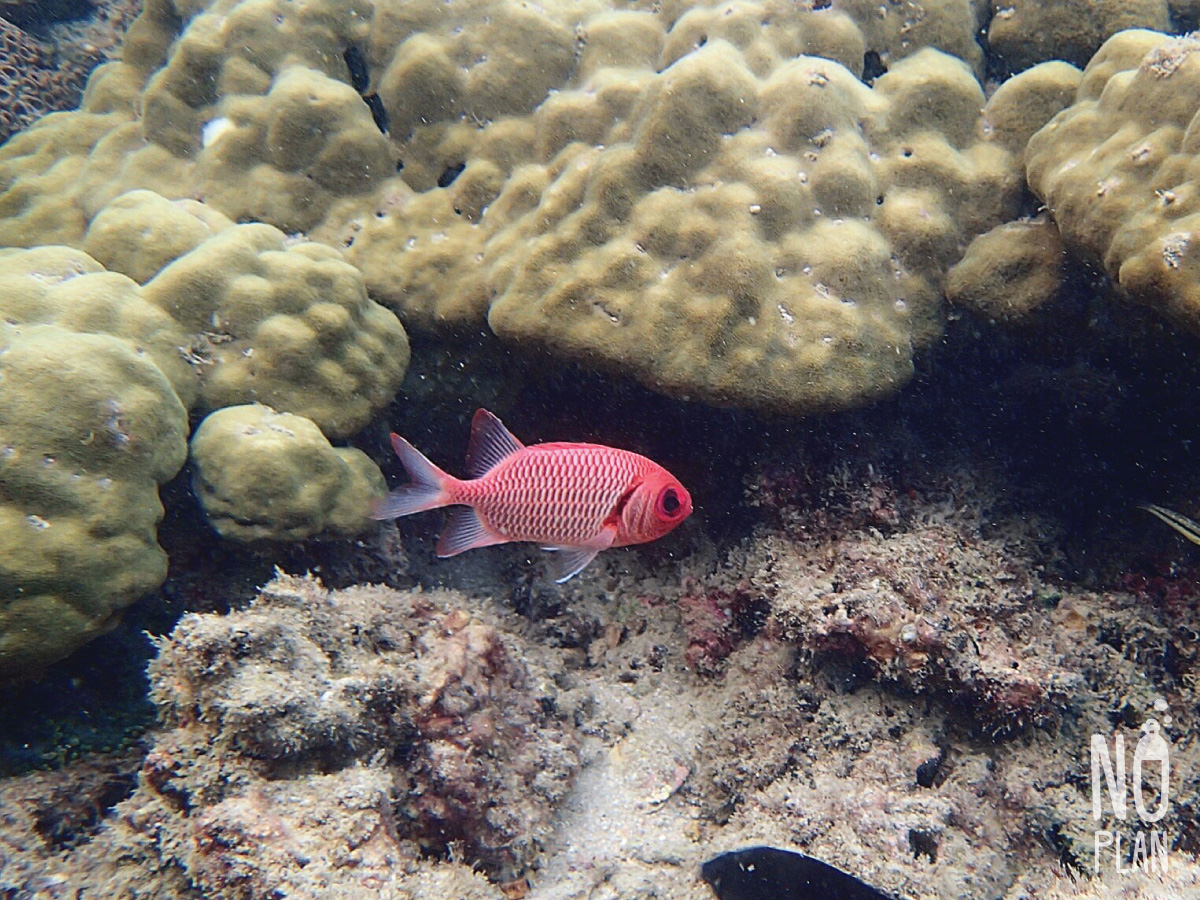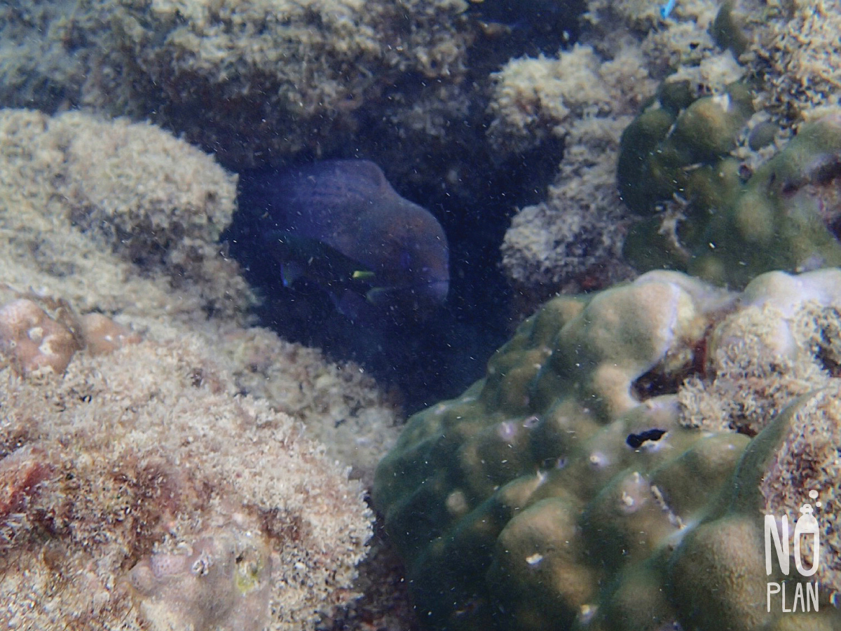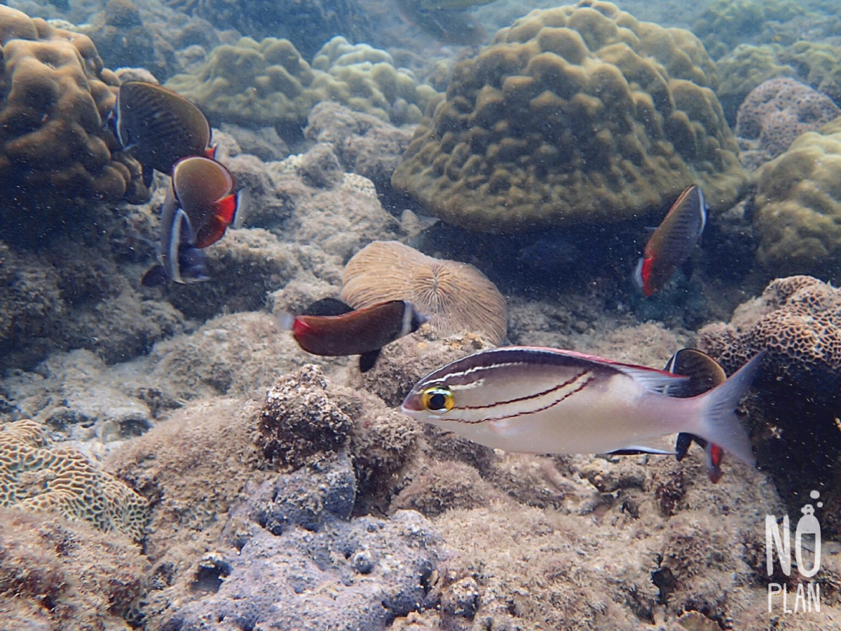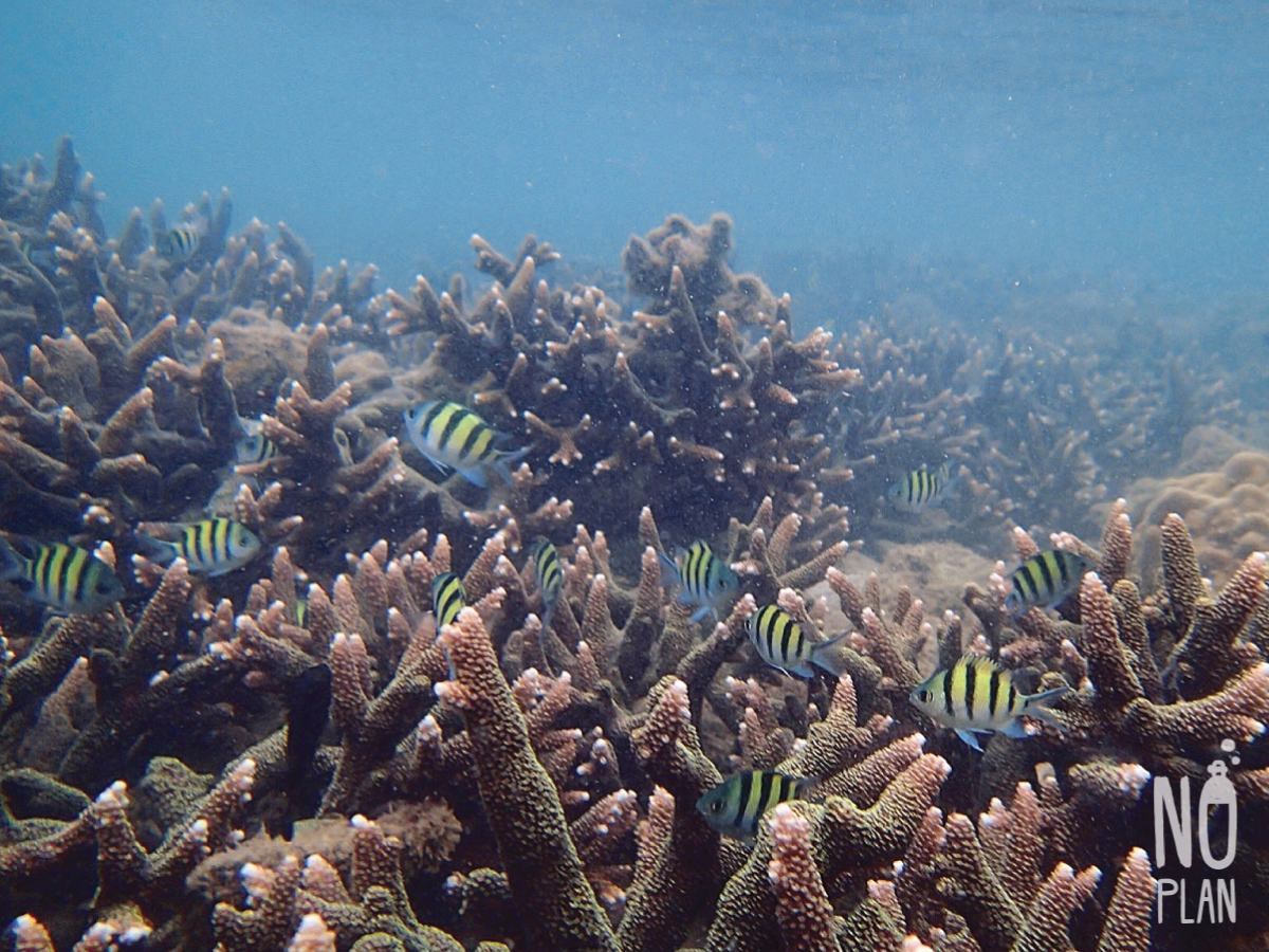 จุดดำน้ำที่นี่ส่วนใหญ่เป็นปะการังโขดหิน กับฝูงปลาตัวเล็กๆเยอะ ไม่หลากหลายเท่าหน้าหาดเรานะ