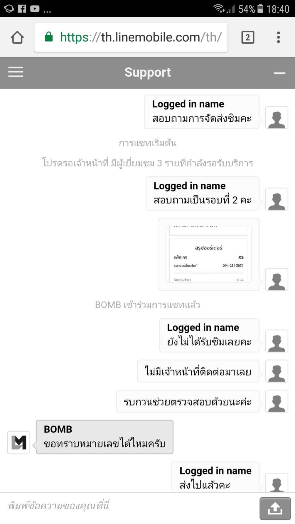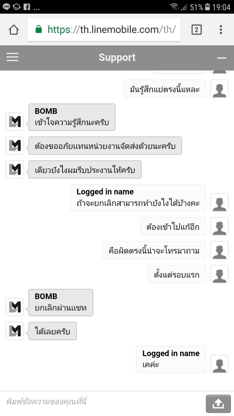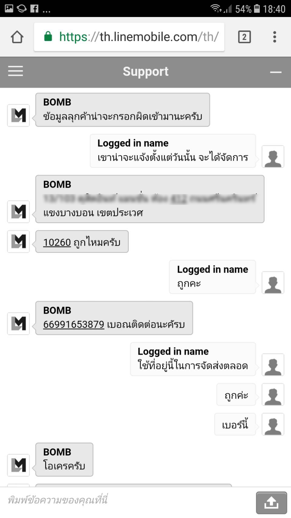แล้วเรื่องที่อยู่ผิดพลาด เราเองก็เเก้ไขไปเเล้วตอนที่พิมพ์ผิด (ขนาดจนท.แชท Line Mobile กับเราเองยังพิมพ์ผิดเลย) จากบางบอน เป็นหนองบอน เเล้วก็ส่งยืนยันไป แต่ไม่รู้ว่าทำไมระบบมันจดจำค่าเก่า พอติดต่อไปทางเเชทรอบที่ 2 เจ้าหน้าผู้ชายที่ส่งกลับมาว่าที่อยู่ถูกต้องมั๊ย เราเองก็กำลังเสียอารมณ์เลยดูไม่ละเอียด ก็ยังตอบไปว่าถูก แต่พอนึกได้ก็ส่งรูปภาพที่อยู่ไปอีกที เพื่อให้ทางเจ้าหน้าที่ดู แล้วก็ไม่รู้ว่าจะดูหรือป่าว เพราะยังจะให้เราเข้าไปแก้เองอีก ทำไมเเก้ให้ลูกค้าไม่ได้เหรอในเมื่อติดต่อคุยกันขนาดนี้เเล้ว