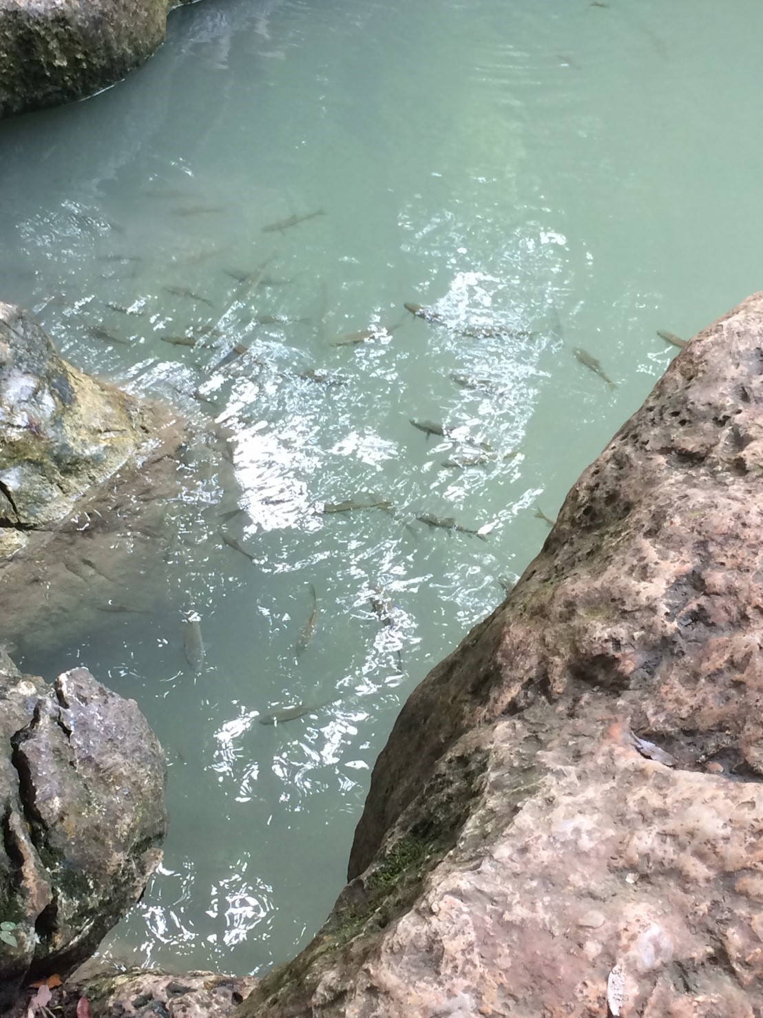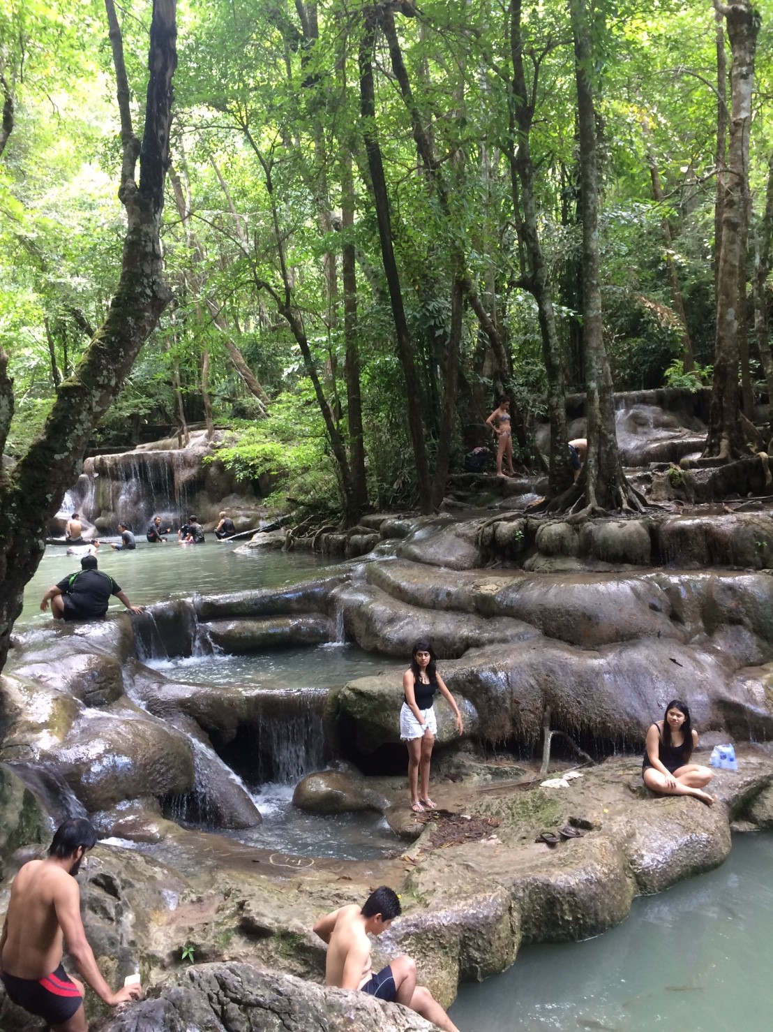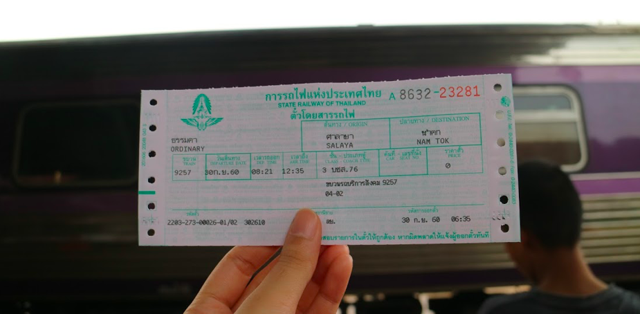 เมื่อถึงวันเดินทางพวกเราไปถึงสถานีรถไฟกันแต่เช้าเพื่อไปจองตั๋วขึ้นรถไฟฟรีจากสถานีศาลายาไปน้ำตก แต่เราจะไปลงที่สถานีกาญจนบุรีเพื่อที่จะไปที่พัก หลังจากนั้นเปิดทริปด้วยข้าวหมกไก่ตลาดศาลายาจร๊า กองทัพต้องเดินด้วยท้อง ระหว่างทางไป รถไฟชั้นสามมีหลายตู้แต่โชคดีที่ได้ตู้ที่มีอากาศถ่ายเทและเห็นวิวข้างนอกอย่างชัดเจน ระหว่างทางก็จะมีคนมาขายก๋วยเตี๋ยวและน้ำ บนรถไฟตลอดทาง คือเราอิ่มกันมากกกกก