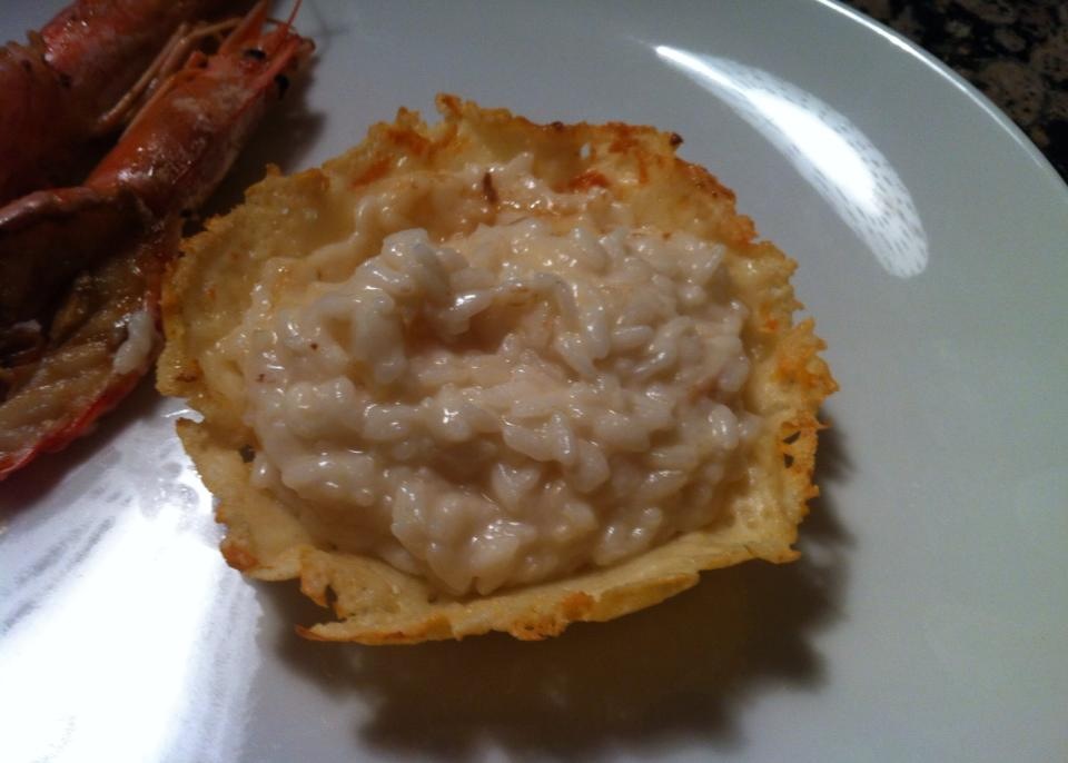 จากนั้นตามด้วย risotto allo champagne เสิร์ฟมาในถ้วยพาร์เมซานชีสเคียงมากับกุ้งอบเนยคอนญัค