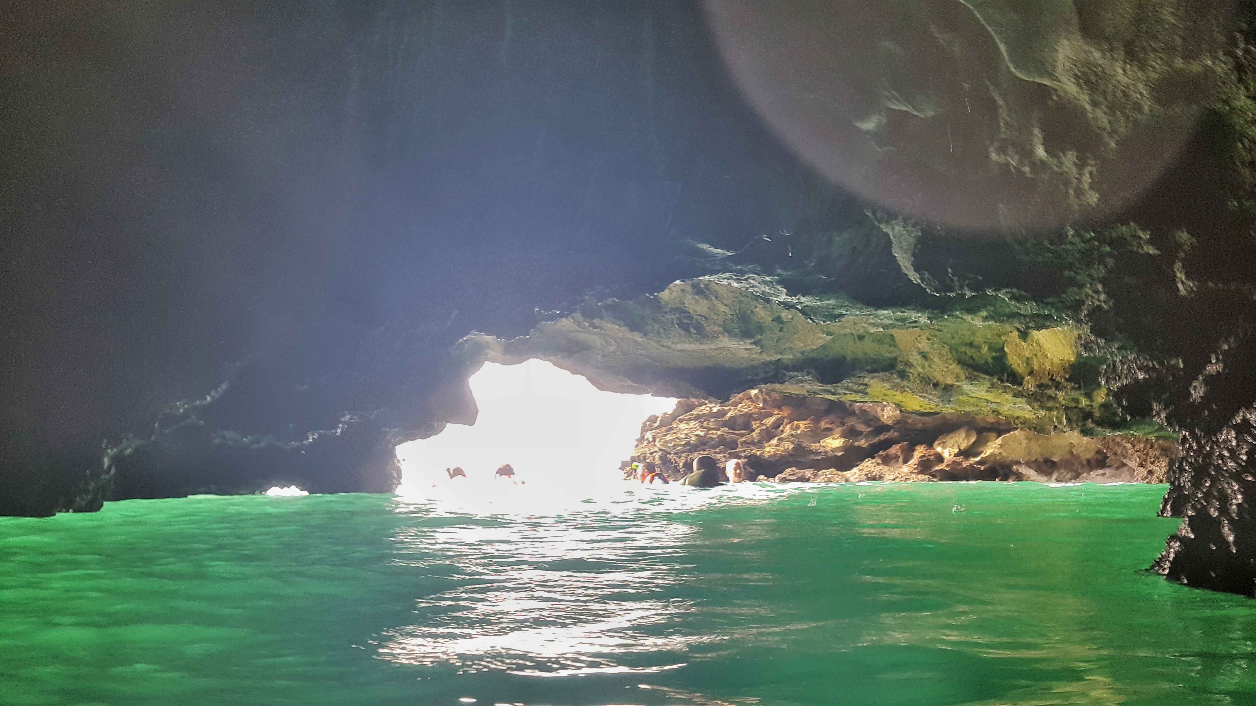 ทีนี้มาถึงตอนจะออกค่ะ ต้องรอจังหวะดี ๆ อีกค่ะ คือต้องลุ้นมาก กลัวคลื่นมา ซึ่งเราก็ไปยืนปากถ้ำซักพัก รอจังหวะค่ะ ทีตอนเรายังถ่ายรูปอยู่นี่ไม่เห็นมีคลื่น ทีพอช้านนจะออกนี่คลื่นซัดกันใหญ่ เลยได้เล่นคลื่นตรงปากถ้ำนั่นแหละค่ะสนุกดีเหมือนกัน พอไกด์ดูแล้วบอกว่าออกไปได้แล้ว ใครพอว่ายน้ำไหวก็ล่วงหน้าไปเลย ส่วนใครไม่ไหวก็เกาะเค้าได้ พอไกด์พูดงี้เราก็รีบเลยสิคะ กลัวคลื่นค่ะ จ้วงสปีดเลยค่ะ คราวนี้นึกถึงตอนที่เราว่าคนอื่นไว้ในใจตอนขาเข้าเลยว่า จะรีบอะไรกันนักหนาห๊ะ มันเกิดขึ้นกับตัวเองแล้วค่ะ ในใจก็คิดเลยว่าคนที่สวนเข้ามาก็คงว่าเราในใจเหมือนกัน แต่ไม่เป็นไรไม่โทษกัน เดี๋ยวขาออกเค้าก็คงรู้เอง 555 (จริง ๆ ตอนเข้า-ออก เราถ่ายเป็นวีดีโอมาค่ะ แต่แน่นอน ทำไฟล์เพื่อเอามาลงไม่เป็น ไม่งั้นคงได้ดูคลิปตอนเข้า-ออกกัน เอาไว้ทำได้แล้วจะมาลงเพิ่มอีกที)