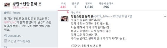 방탄소년단 문학 봇) จึงปรากฏขึ้นบนโลกอินเตอร์เน็ต แอคเคาท์เปิดขึ้นเพื่อแฟนคลับของ BTS จะได้นำชิ้นงานวรรณกรรมมาแบ่งปันกัน อาทิเช่น ข้อความจากงานเขียนของคุณคิมยอนซู เรื่อง ‘우리가 보낸 순간’ ไม่บ่อยนักที่จะได้เห็นปรากฏการณ์