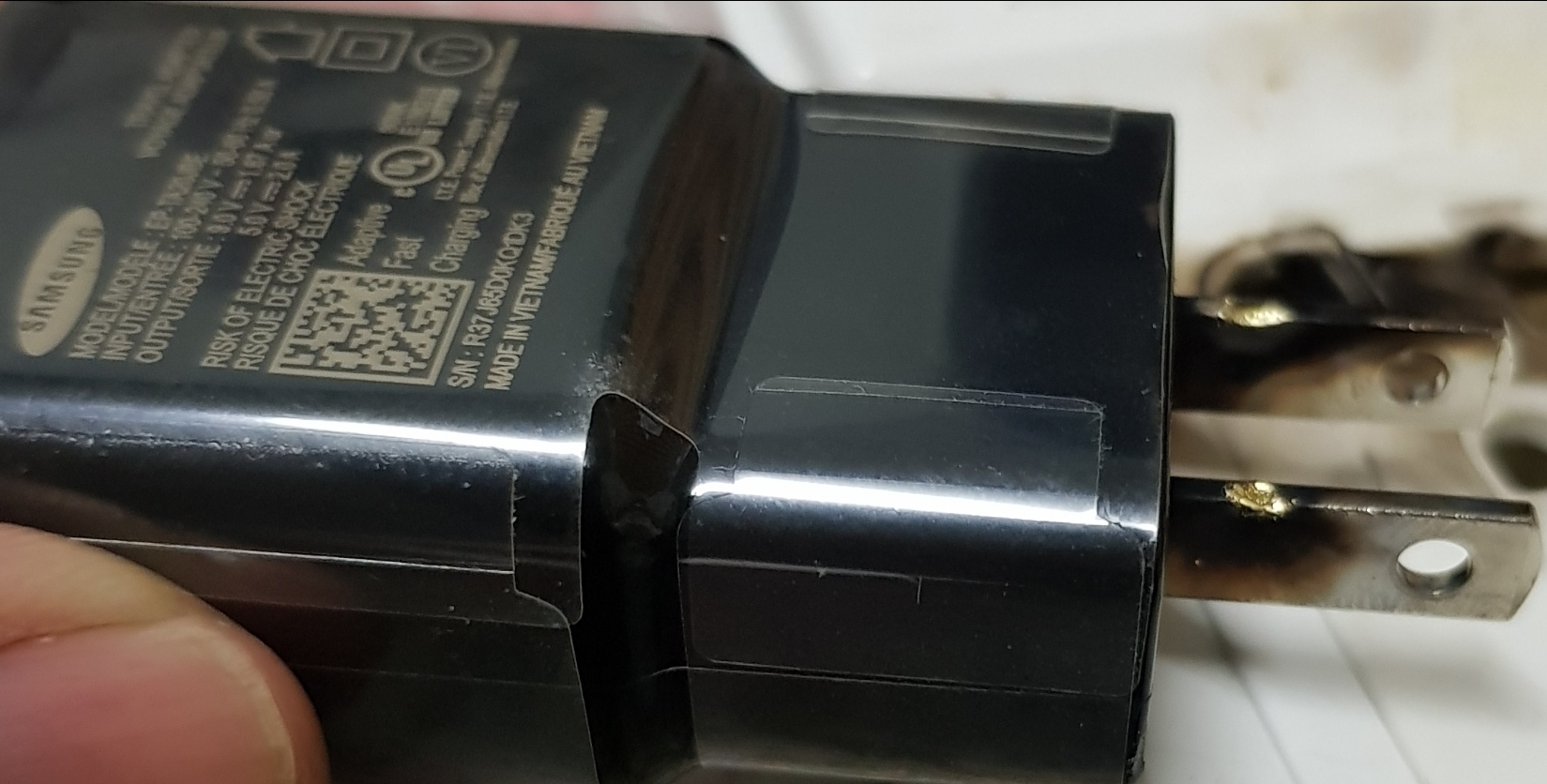 เกิดเหตุวันที่ 3 ต.ค. 60 เวลา ประมาณเกือบ 5 ทุ่ม ชาร์ต S8+ เปิดเครื่องเล่นweb ไว้ที่หัวเตียงได้กลิ่นเหม็นไหม้ และมีเสียงไฟชอร์ตดังประทุและประกายไปจากหัวชาร์ต ดีที่ยังไม่นอนเลยรีบถอดปลั๊กออกก่อนไม่งั้นไฟไหม้เตียง