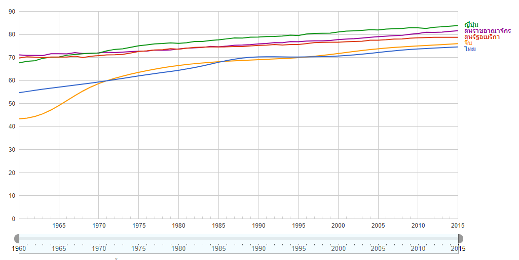 ลองมาดูเล่นๆ กันครับ เอามาให้ดู 5 ประเทศ นี่เป็นสถิติจากธนาคารโลกซึ่งอัพเตดล่าสุดเมื่อเดือนกันยายนที่ผ่านมา จะสังเกตได้ว่าอายุขัยเฉลี่ยของมนุษย์จะเพิ่มขึ้นทุกปี ซึ่งแปรผันตรงกับความก้าวหน้าของวิทยาการทางการแพทย์และสาธารณะสุขครับ อย่างของประเทศไทยย้อนกลับไปปี 1960 (เมื่อ 57 ปีก่อน) อายุขัยเฉลี่ยของคนไทยอยู่ที่ 54.7 ปี ในขณะที่ปี 2015 (เมื่อ 2 ปีที่แล้ว) ในระยะเวลาเพียง 50 กว่าปี อายุขัยเฉลี่ยของคนไทยก็เพิ่มมาถึง 74.6 ปีเลยครับ