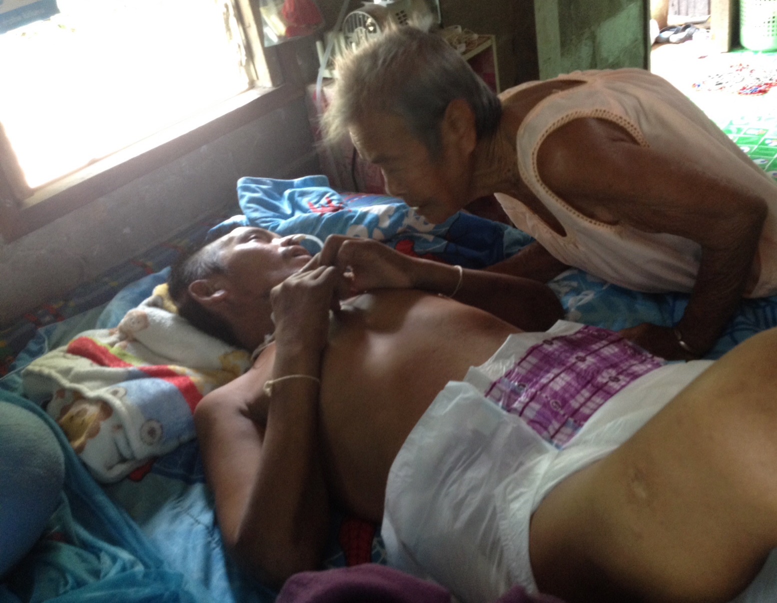 ปัญหาของผมตอนนี้คือไม่มีเงินที่จะซื้อของใช้ในชีวิตประจำวันให้พ่อ เพราะไม่ได้ไปทำงานเกือบ 2 เดือนแล้ว ตั้งแต่พ่อเข้าโรงพยาบาล ไม่ใช่ว่าผมขี้เกียจ ไม่อยากไปทำงาน ถ้าผมจะปล่อยปะเลยแล้วหนีไปทำงานมันก็ทำได้ แต่ผมทิ้งพ่อไปไม่ได้ ถ้าผมไป พ่อต้องแย่กว่าเดิมแน่ ๆ ที่น่าห่วงคือแผลกดทับ ใจผมอยากไปทำงานแทบตาย ไม่มีงาน ไม่มีเงินนี้มันแย่จริง ๆ ถ้าทำคืออยากไปทำในกรุงเทพฯ หรือในตัวจังหวัดให้ได้งานดี ๆ ในอำเภอที่ผมอยู่นี้ หางานยาก ไม่ค่อยมีงาน ถ้ามีก็มีแค่งานรับจ้างได้เงินไม่เท่าไร 7-8 วันมานี้ ผมก็ไปขอเขาทำงานที่ร้านอาหาร ได้วันละ 300 ซื้อของให้พ่อแทบจะไม่พอ อย่างวันนี้หลังจากเลิกงานเกือบ 4 ทุ่มแวะซื้ออาหารเหลวแบบเป็นกระป๋องให้พ่อ กระป๋องละ 75 บาท ป๋องหนึ่งให้ได้ 1 มื้อ เพราะอาหารเหลวแบบชงที่ซื้อจากโรงพยาบาลถุงละ 774 บาทนั้น หมดแล้ว ตอนนี้ไม่เงินพอที่จะซื้อได้