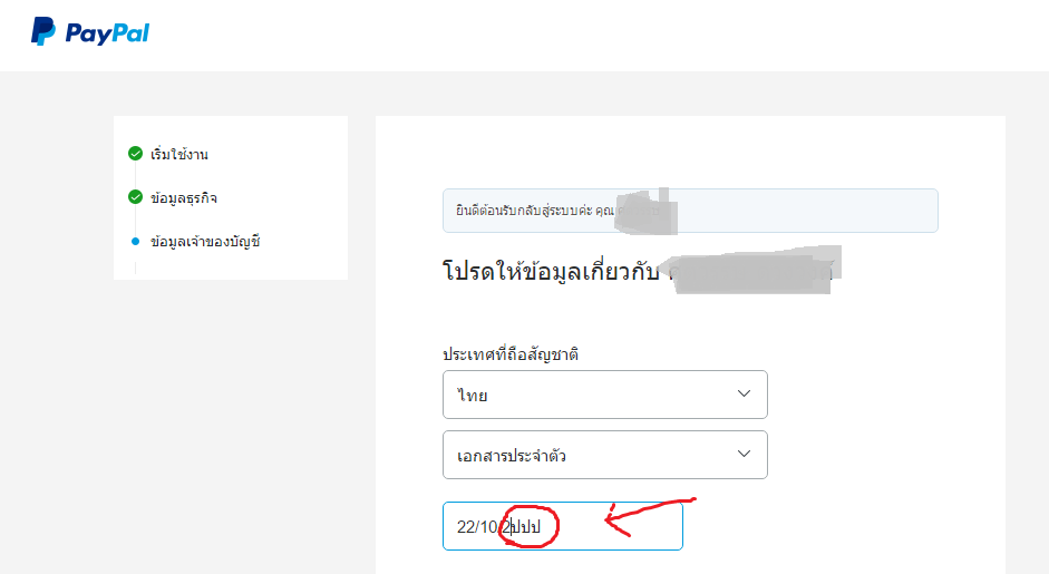 สวัสดีครับ คือผมจะสมัครPaypal แต่พอถึงขั้นตอน ใส่ข้อมูลเจ้าของบัญชี ก็ใส่เลขบัตรประตัวประชาชนครบแล้ว ตอนใส่วันเดือนปีเดือน กลับใส่ พ.ศ. ไม่ได้ ได้แค่ตัวแรกตัวเดียว เลยไม่สามารถที่จะสมัครได้สมบูรณ์ อยากทราบว่าผมทำขั้นตอนไหนผิดหรือเปล่าครับ ตามรูปเลยครับ ใส่ได้แค่นั้น