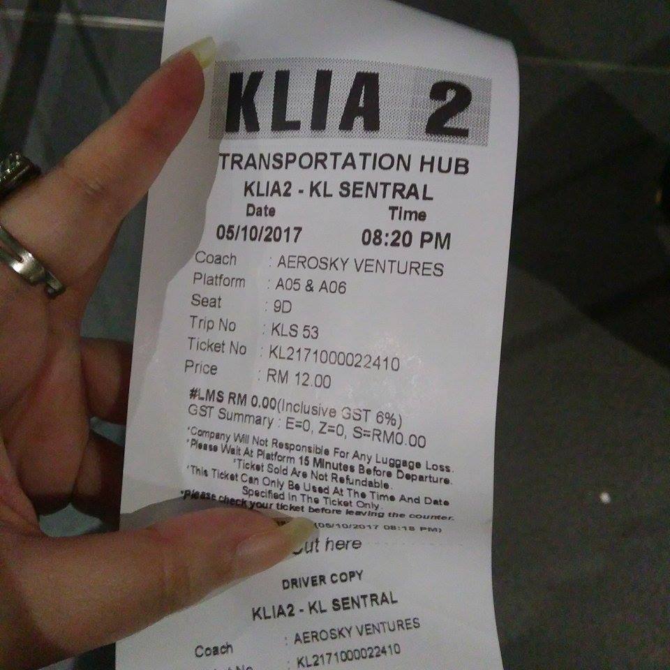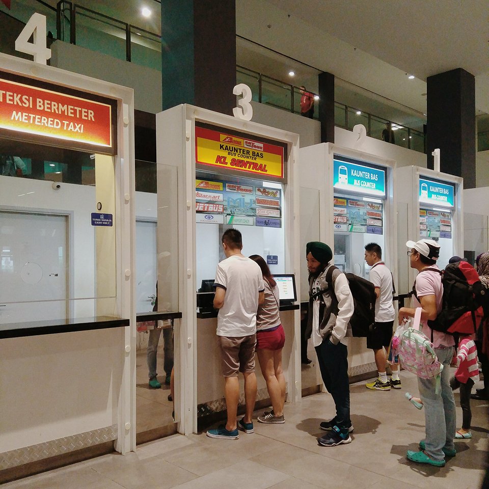 ออกตม.เสร็จก็เดินนานมากเวอร์กว่าจะไปถึงจุดที่ลงบันไดเลื่อนเพื่อจะไปหารถบัส รถเช่า บลาๆ เพื่ออกจากสนามบิน ลงบันไดเลื่อนที่ว่ามายังชั้น G ก็จะพบกับบูธขายตั๋วเรียงกันเป็นล็อกๆตามภาพนี้ เป็นบูธฝั่งซ้ายมือเมื่อลงจากบันไดเลื่อนนะ ก็ให้หาช่องหมายเลข 3 จะเป็นตั๋ว Skybus เดินตรงไปบอกเขาเลยว่าเอาตั๋วใบนึง สำหรับผู้ใหญ่ 12RM แต่ของเด็กน่าจะครึ่งราคา รถ Skybus นี้จะมีตารางออกจากที่สนามบินและจาก KL Sentral ทุกๆ 20 นาทีนะ รอไม่นานเลย ตามที่ตั๋วระบุเวลาออกก็คือสองทุ่มยี่สิบโดยประมาณ เราซื้อตั๋วเสร็จก็เดินไปยืนรอด้านนอก ในตั๋วจะมีบอกว่าต้องรอจุดออกรถเบอร์อะไร ก็ไปเข้าคิวตามนั้น เรารอแค่ 7-8 นาทีรถก็มาแล้ว ในตั๋วเขาระบุเลขที่นั่งด้วยแหละแต่เอาจริงๆคนนั่งกันสะเปะสะปะ ไม่ต้องไปแคร์มัน (ของขากลับเราตั๋วบอกไม่ระบุที่นั่ง อันนี้แล้วแต่เลยเพราะยังไงก็นั่งตามใจชอบอยู่ดี)