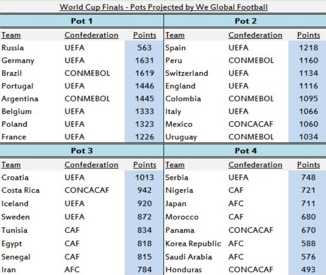 มาครั้งนี้ จะแบ่งตาม Ranking ล้วนๆ ยกเว้นเจ้าภาพรัสเซียที่อยู่โถ 1 อัตโนมัติ