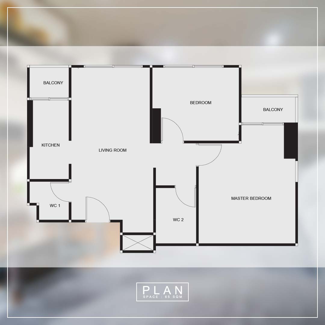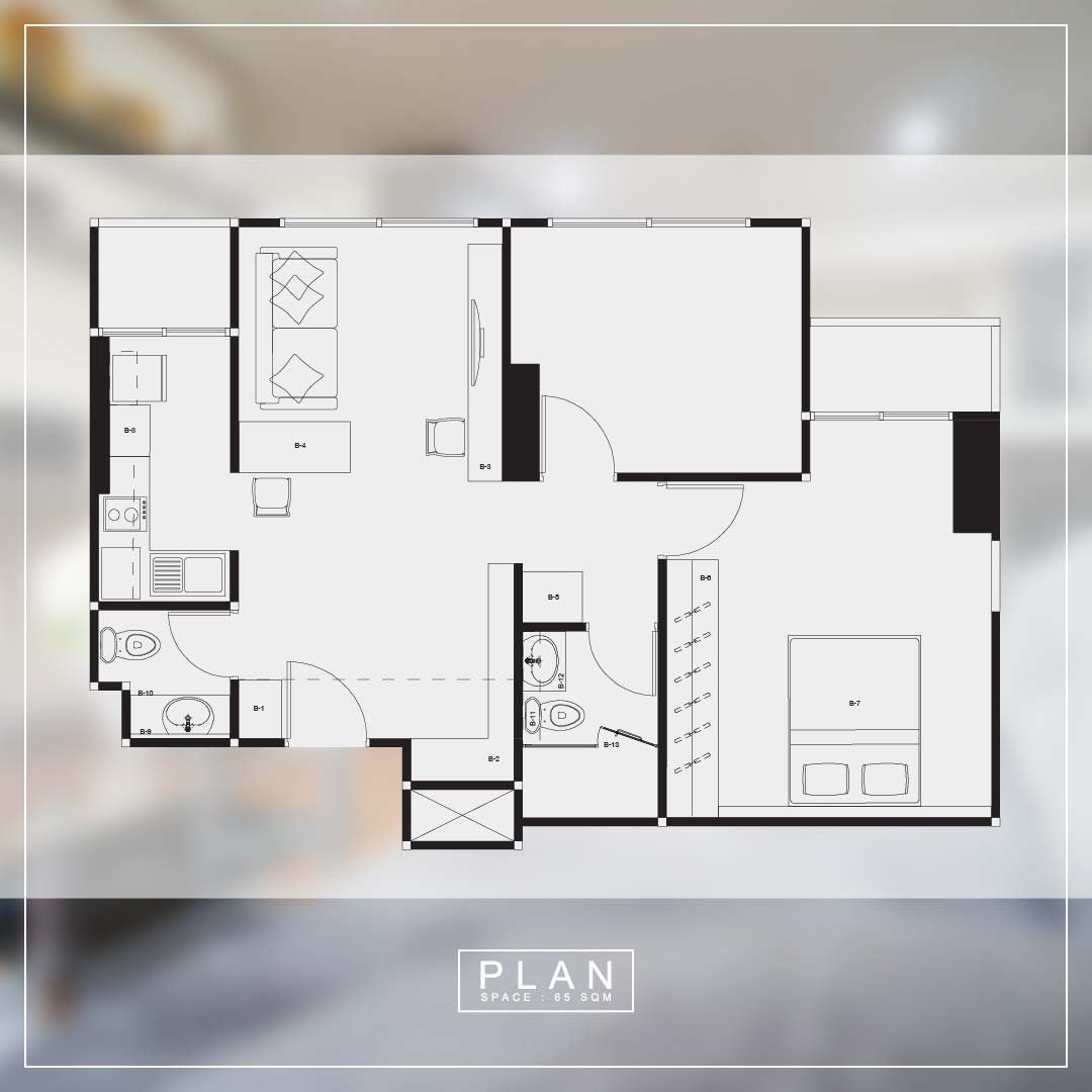 นี่คือภาพแปลนของห้องนี้นะคะ ประกอบด้วย ห้องนั่งเล่น ห้องครัว ห้องนอน 2 ห้อง และห้องน้ำ 2 ห้อง