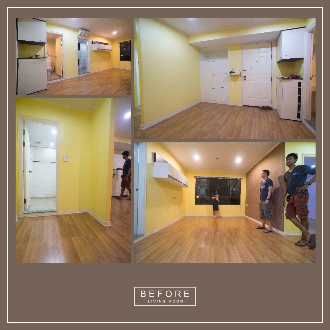 มาดูกันว่าห้องเดิมเป็นยังไงกันบ้าง เริ่มที่ห้องนั่งเล่นกันก่อน จากภาพจะเห็นว่าห้อง มีเฟอร์นิเจอร์เก่าอยู่ด้วย ผนังห้องทาไว้ด้วยสีเหลืองสด และบางส่วนมีวอลเปเปอร์อยู่ด้วย พื้น และบัวพื้นยังสภาพดีอยู่ฉะนั้นเราจะใช้ของเดิมในส่วนนี้ ส่วนเฟอร์นิเจอร์เดิม เจ้าของไม่ต้องการเก็บไว้ ฉะนั้นต้องจัดการรื้อออกไปให้หมดก่อน