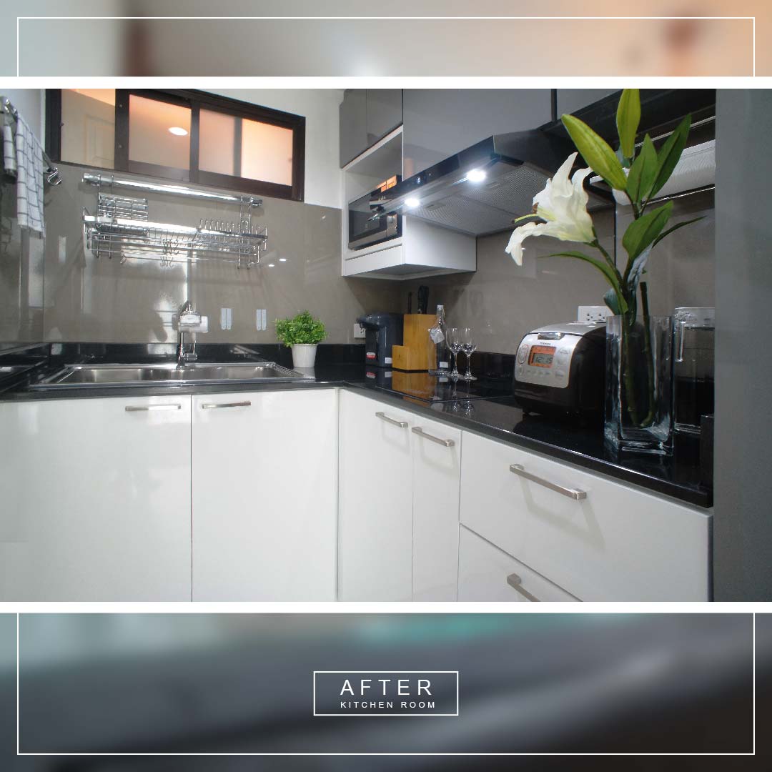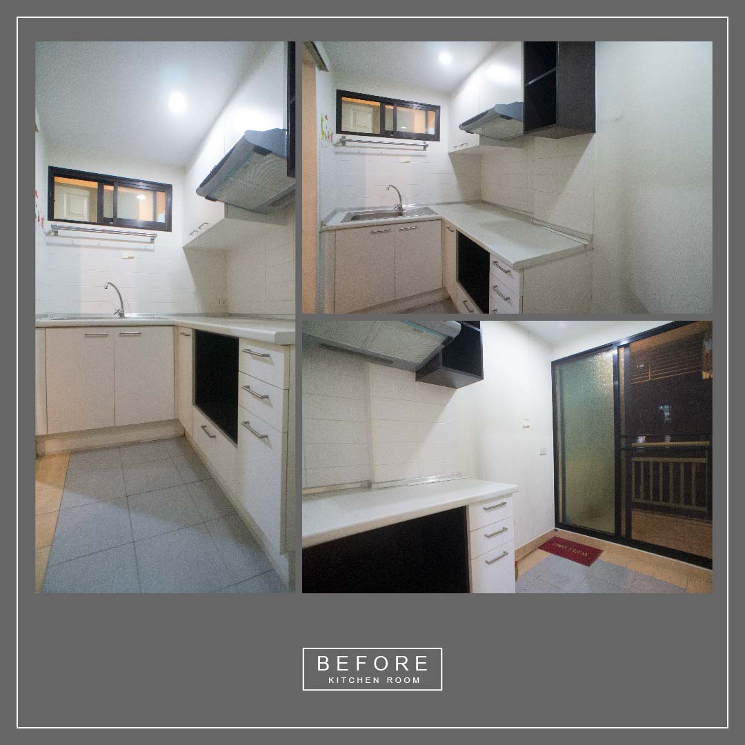 สำหรับห้องครัว ตามที่เห็นในภาพเราต้องรื้อออกหมดเลยคะ แล้วทำใหม่ทั้งหมด ทั้งตู้ และกระเบื้องผนัง รวมทั้งติดตั้งอุปกรณ์ต่างๆ เข้าไปแทนที่ของเดิมด้วย