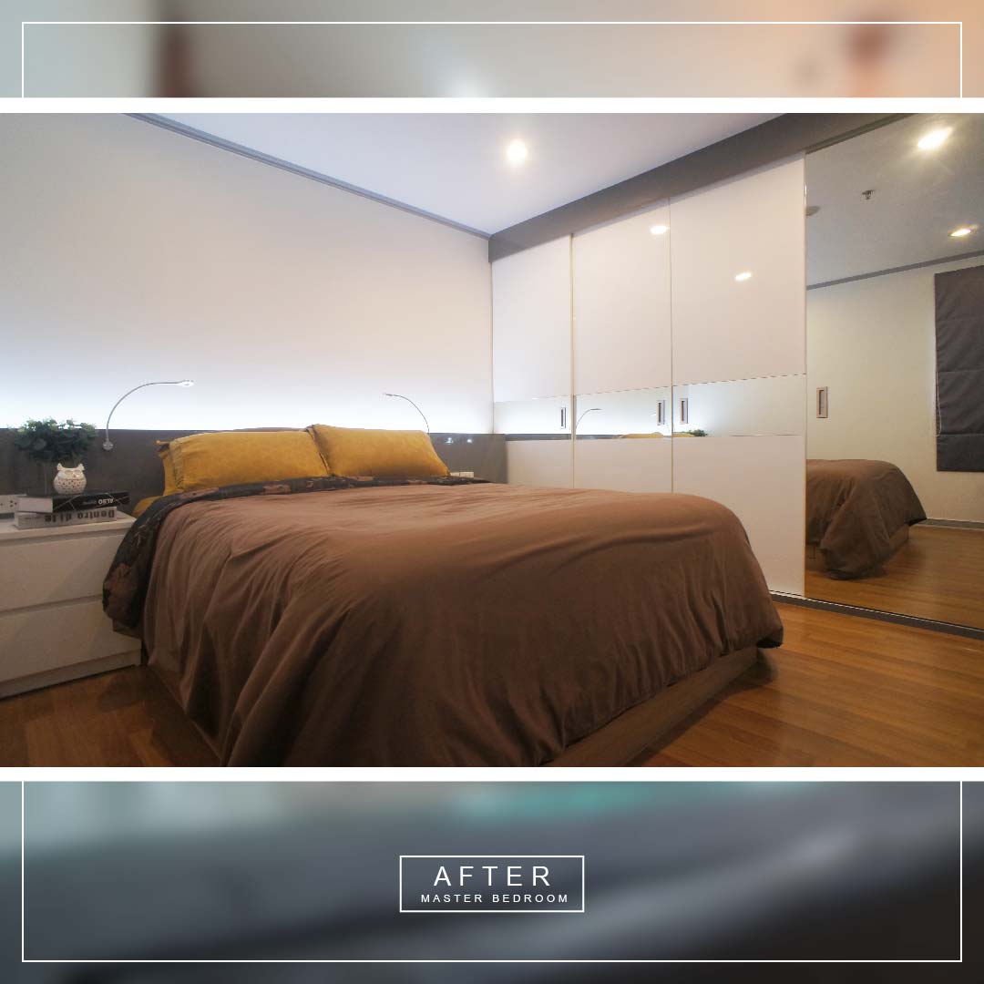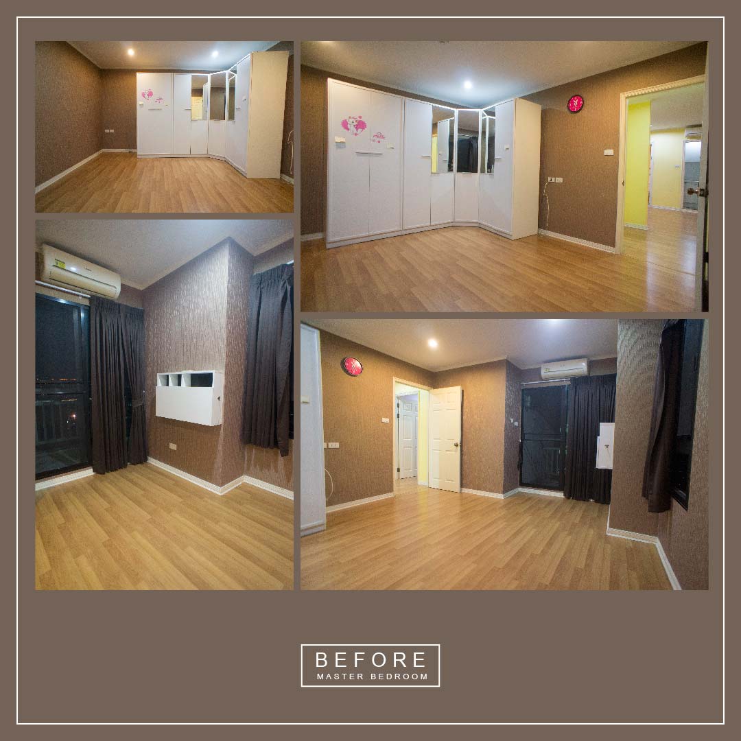 ห้องนอนใหญ่ ห้องนี้ก็เช่นกันรื้อเฟอร์นิเจอร์เดิมทั้งหมดคะ ผนังห้องเดิมเป็นวอลเปเปอร์สีน้ำตาล