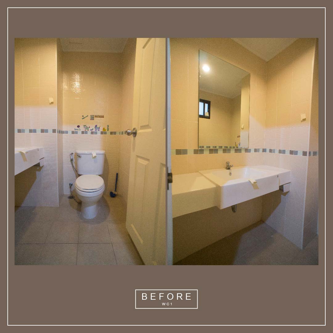 ห้องน้ำ 1 และ 2 งานจะหนักหน่อย เพราะเราต้องรื้อใหม่ทั้งหมดคะ ทั้งกระเบื้องพื้น ผนัง สุขภัณฑ์ต่างๆ เปลี่ยนใหม่ยกเซทเลยคะ