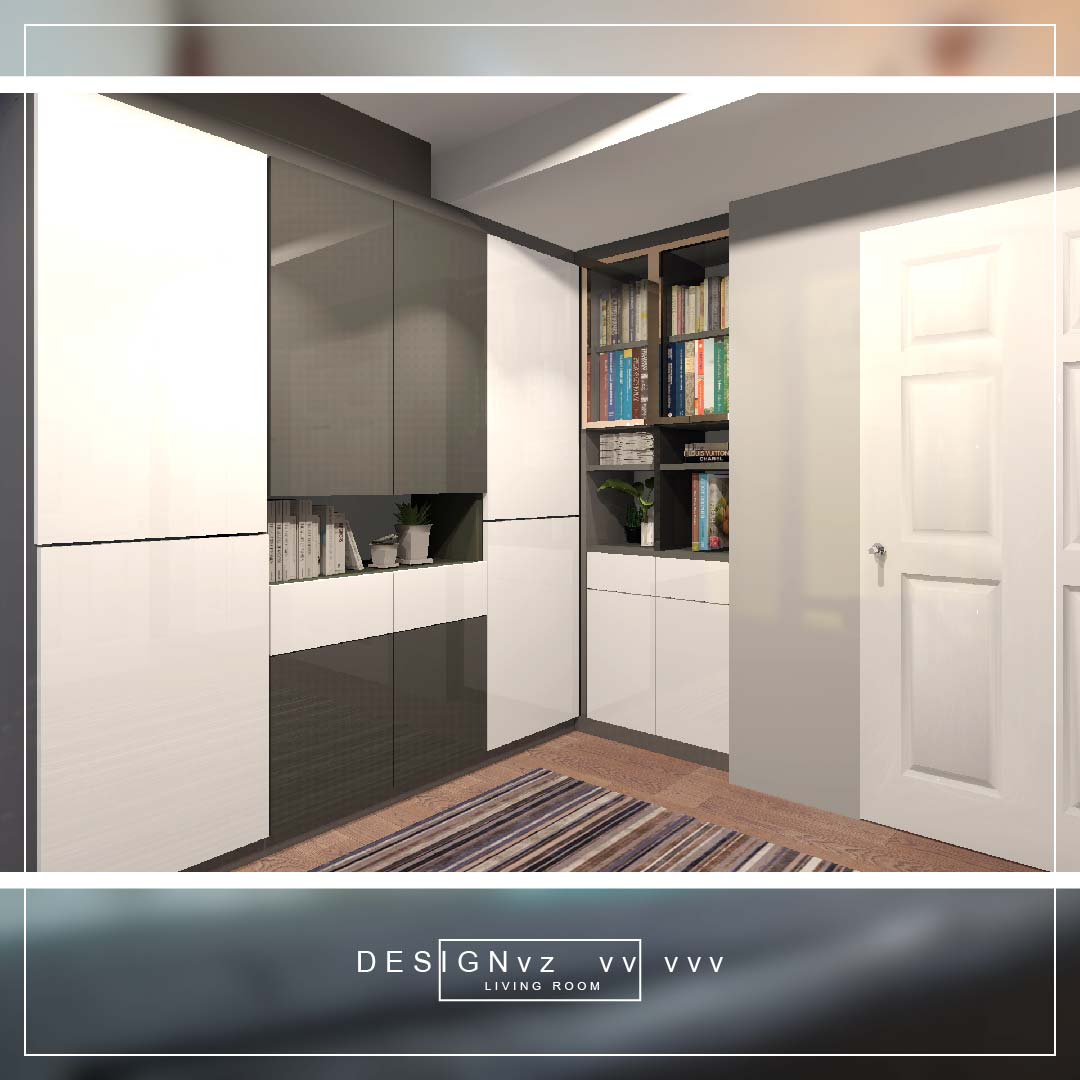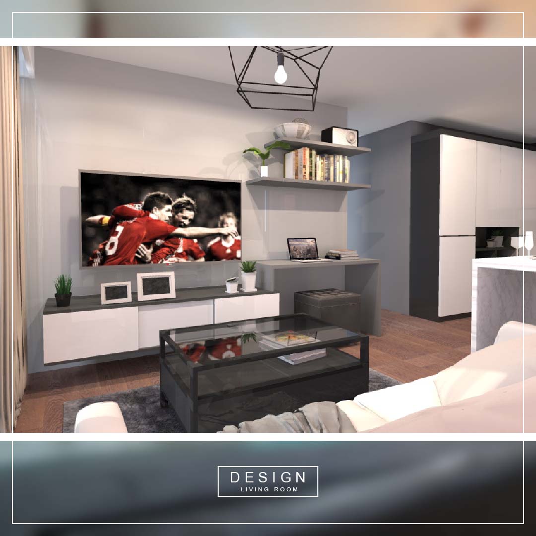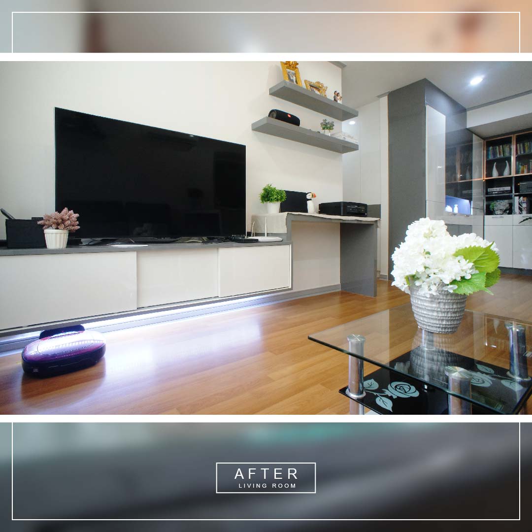 เนื่องจากพื้นที่ห้องไม่มากนัก เราเลยจัดโต๊ะทำงานไว้กับทีวีเสียเลย โดยทำตู้ทีวีเป็นตู้แบบลอย ให้มีพื้นที่ใต้ตู้สำหรับจอด ROBOT เครื่องดูดฝุ่น และโต๊ะทำงาน พร้อมชั้นวาง สำหรับวางปริ้นเตอร์ และอุปกรณ์เครื่องเขียนอีกเล็กน้อย