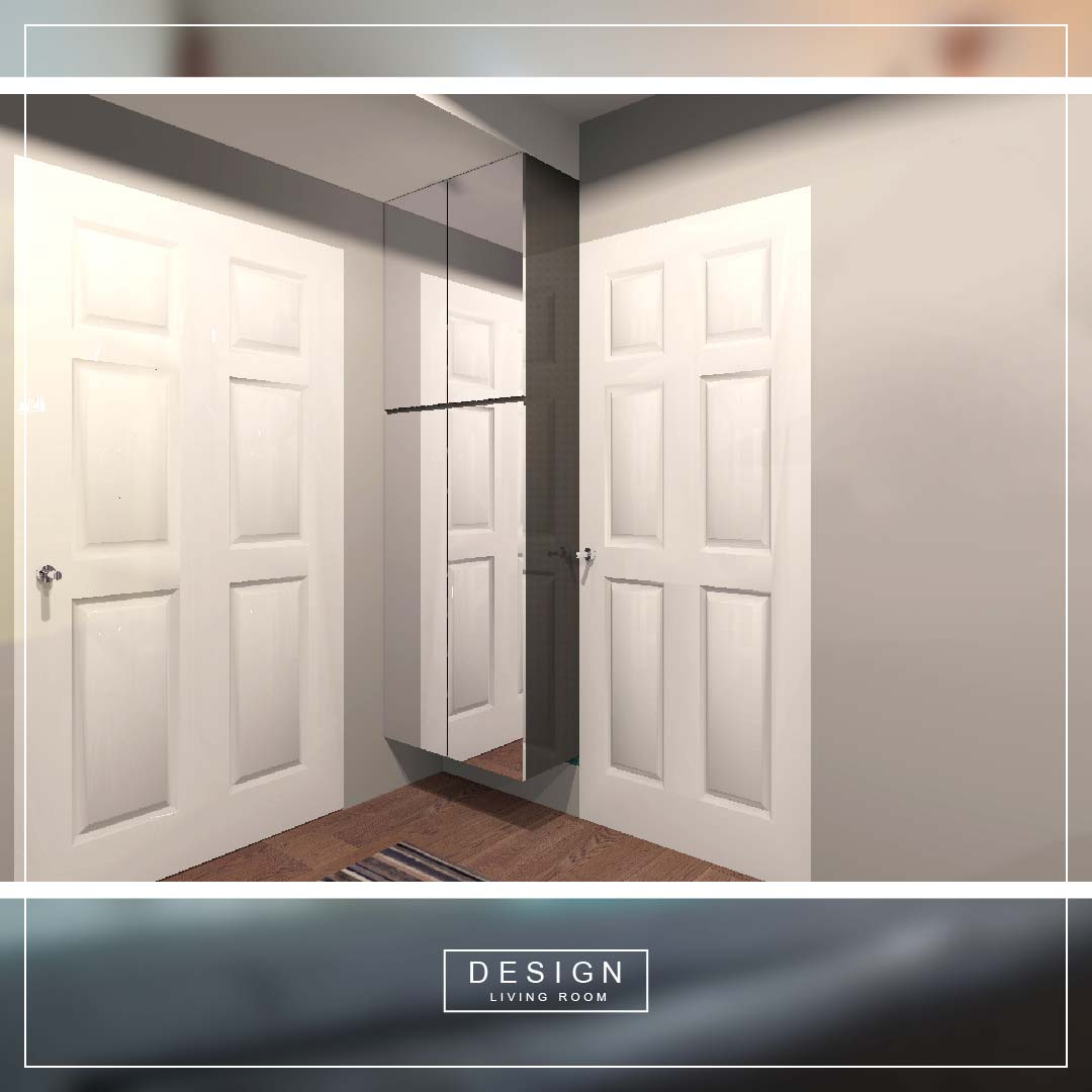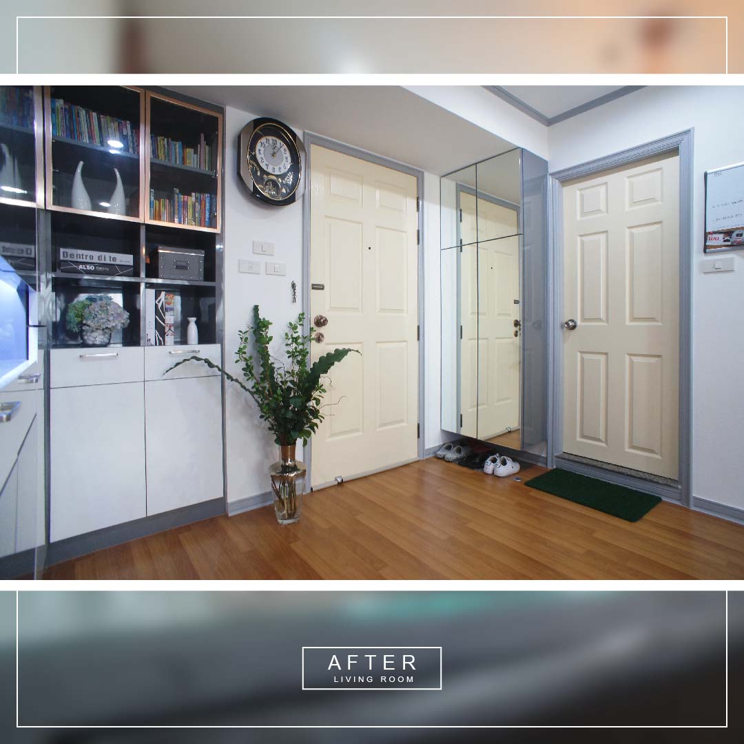 บริเวณนี้คือ ถ้าเดินเข้าห้องมาจะเจอตรงนี้ก่อนเป็นส่วนแรก ลูกค้าต้องการพื้นที่เก็บของ และที่สำคัญคือกระเป๋าเดินทางใบใหญ่ๆ 2-3 ใบ แต่ก็ยังทิ้งพื้นที่เล็กๆ ไว้สำหรับวางของตกแต่งได้บ้าง เพื่อไม่ให้ห้องดูทึบตันเกินไป