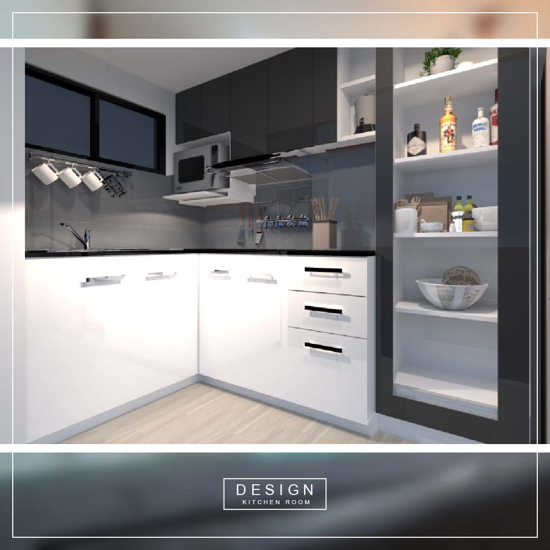ห้องครัว ส่วนนี้ความต้องการคือ ซิงค์ล้างจานแบบหลุมใหญ่ เตาไฟฟ้า ช่องสำหรับไมโคเวฟ ที่มีลิ้นชักเลื่อนออกมาได้ เวลาจะยกอาหารออกจากไมโครเวฟ สามารถวางพักบนลิ้นชักก่อนได้ ก่อนที่จะยกลงมา เหมาะมากสำหรับของร้อน และคนตัวเล็กๆ ที่อาจเอื้อมไม่ถึงในทีเดียว และตู้สำหรับเก็บอาหารแห้ง