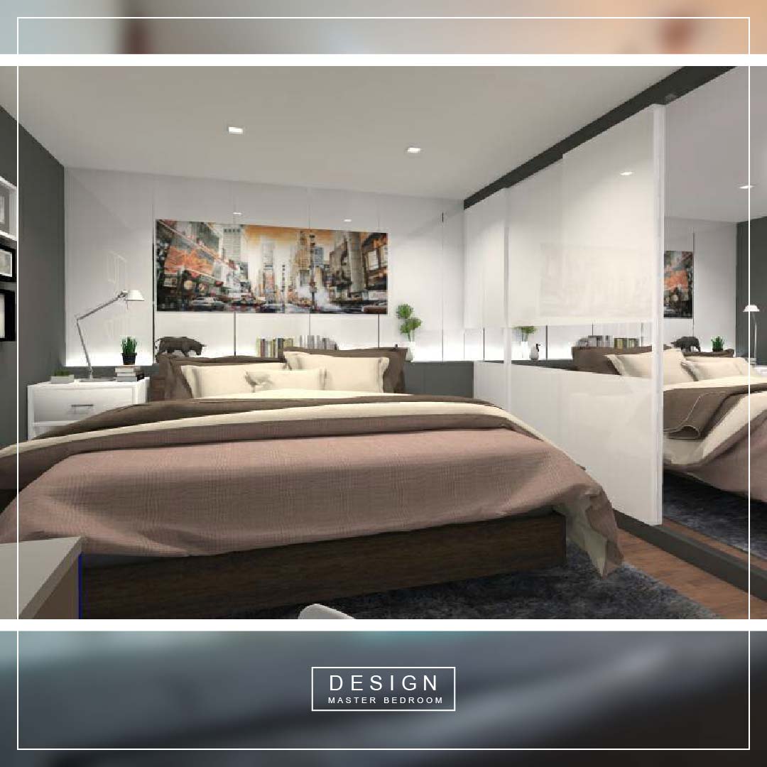 ห้องนอน ต้องการตู้เสื้อผ้าใหญ่หน่อย ใช้งาน 2 คน เก็บเสื้อผ้า และเครื่องประดับได้ด้วย หน้าบานกระจกบานใหญ่เหมาะสำหรับแต่งตัวได้สะดวก ส่องได้เต็มตัว หัวเตียงกรุซ่อนไปเพื่อความสวยงาม และเพิ่มไฟส่องสำหรับอ่านหนังสือทั้ง 2 ด้าน เพราะเจ้าของชอบอ่านหนังสือก่อนนอน