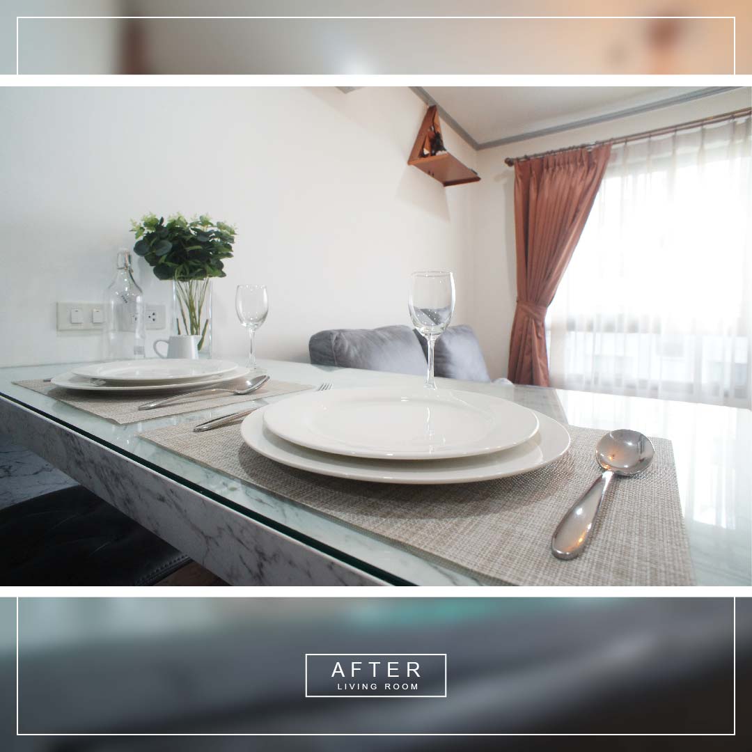 ส่วนของโต๊ะทานอาหาร ลูกค้าเป็นคนชอบทานอาหารไปพร้อมกับการดูทีวี เราจึงจัดโต๊ะอาหารไว้ข้างโซฟา และหันหาเข้าทีวี จะได้ดูได้สะดวก และเพิ่มปลั๊กไฟไว้ให้สำหรับชาร์ตแบตมือไปพร้อมกันด้วยได้