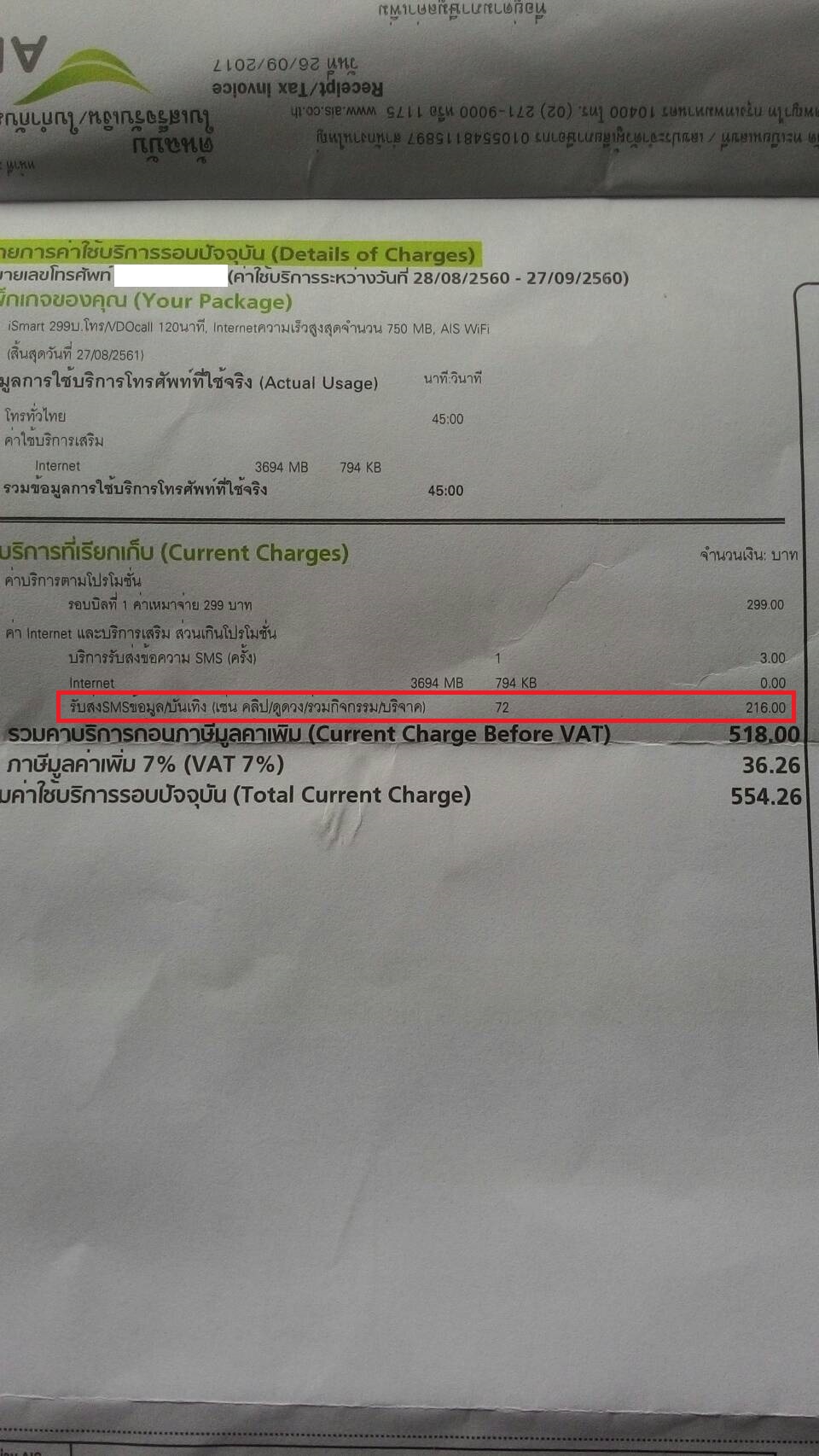 คือเบอร์ที่โดนเป็นของ พ่อ นะครับ ผมดำเนินการให้พ่อเปิดเบอร์ใหม่เป็นรายเดือนเนื่องจากเบอร์เก่าเติมเงินชอบโดน SMS กินเงินบ่อยตรวจสอบลำบาก เปิดมานานพอสมควรไม่มีปัญหา มาเดือนนี้ มีข้อความบันเทิงมาถึง 72 ครั้งเป็นเงิน 200 กว่าบาท จะจัดการอย่างไรได้บ้างกับยอดที่ไม่ได้สมัครนี้