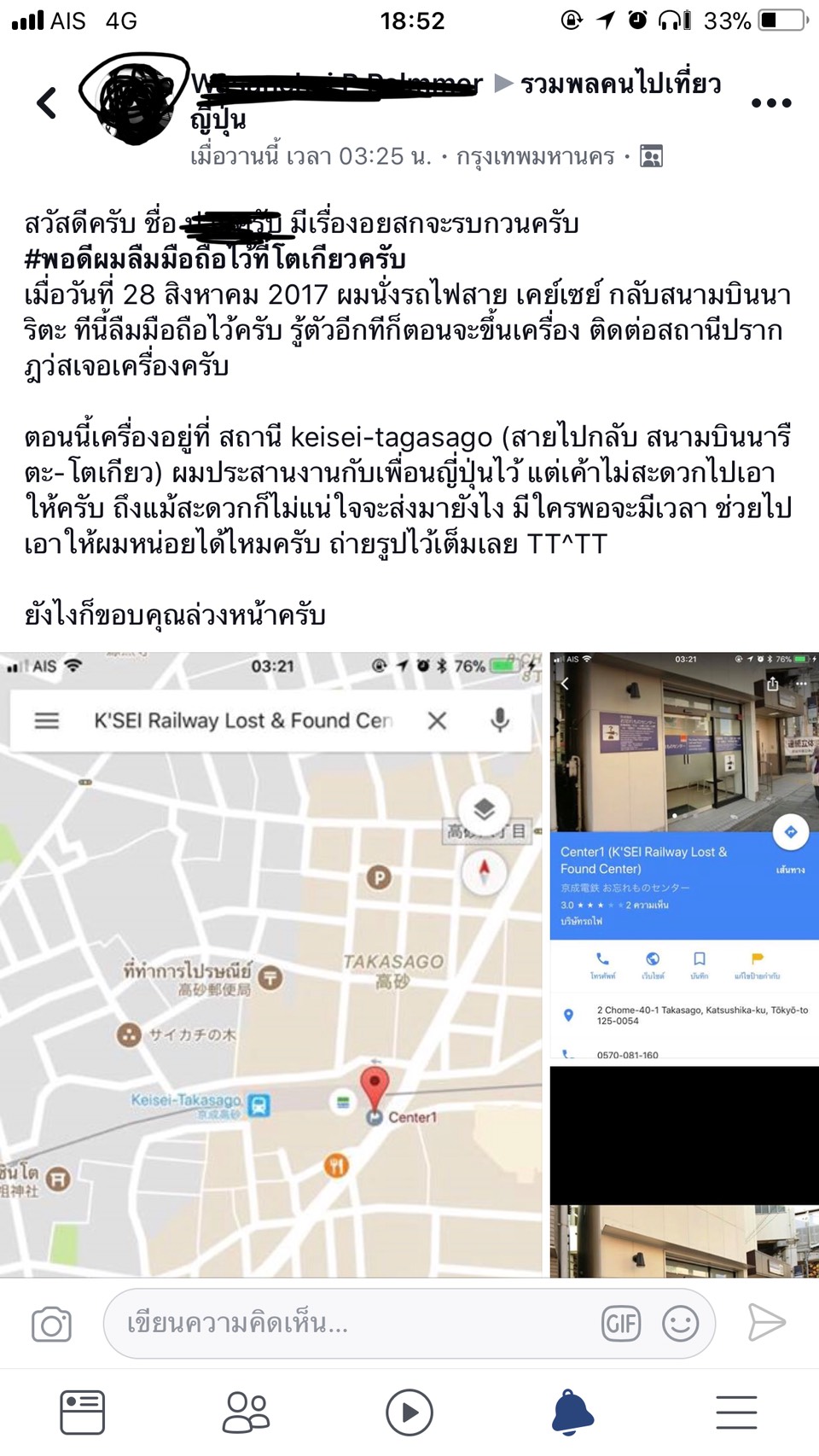 ดีหน่อยที่ผมมีเพื่อนคนญี่ปุ่นอยู่บ้าง แต่นางอยู่โอซาก้าจ้าาาา  ถถถถถถถ โอเคร อย่างน้อยก็ให้นางประสานเรื่องไว้ก่อนก็ยังดี ไม่ให้เค้าเอาไปทิ้งก็พอ
