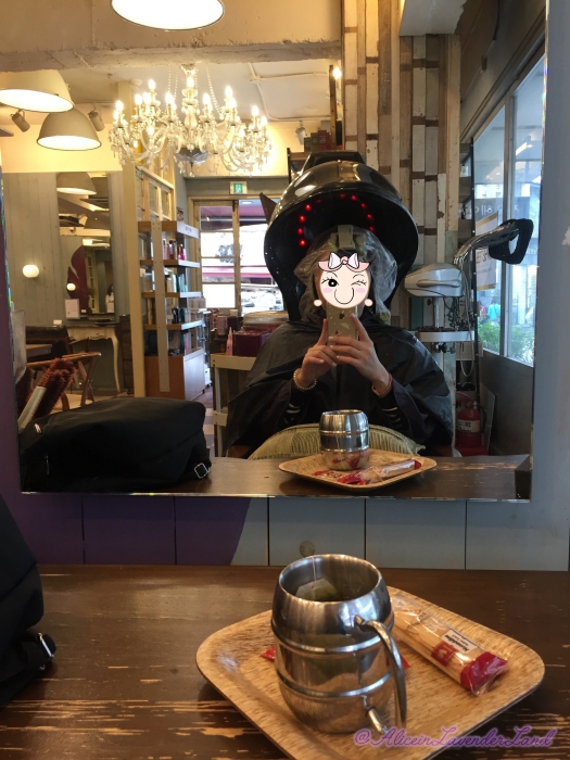 ต่อมาจะเริ่มดัดผมละคะ พอจะดัดผมทางร้านก็เอาโรลดัดผมมา แต่จะเป็นโรลหินภูเขาไฟสีเขียวอ่อน เราก็เลยถามว่าไม่ได้ใช้เครื่องดัดผมดิจิตัลที่แบบเหมือนเอเลี่ยนมีสายมาเสียบๆบนหัวเหรอ มือก็ชี้ไปที่เครื่องนั้นที่วางอยู่ด้านข้าง ช่างที่ทำให้ก็บอกว่ามันทำได้เหมือนกัน แต่หินร้อนนี้จะทำลายผมน้อยกว่า เราก็โอเคๆ ทำไปๆ ช่างถามว่าจะทำทรีทเมนต์ไปด้วยไหม ผมจะได้ไม่เสีย เราก็ถามว่าเท่าไหร่ ช่างก็บอกราคามาของแต่ละยี่ห้อ สุดท้ายมาจบที่ทรีทเมนต์ของเกาหลีซึ่งราคาแพงที่สุด กัดฟันไหนๆมาแล้วต้องลองให้ครบสูตร ไหนๆก็มาละ รูปด้านล่างเป็นรูปที่กำลังดัดค่ะ