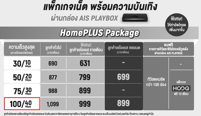 ตามรูป AIS ได้ปรับเปลี่ยนค่าอัพโหลดของแพ็กเก็ต เดิม100/10M เป็น100/40M ซึ่งตอนนี้ผมใช้แพ็กเก็ตนี้อยู่ 100/10M