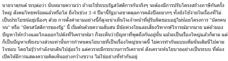 หากเราเชื่ออย่างสุจริตใจว่า โครงการบัตรสวัสดิการแห่งรัฐ เป็นนโยบายตามแผนยุทธศาตร์ National e-Payment ที่จะบูรณาการสวัสดิการ เพื่อปูทางให้สังคมไทยก้าวไปสู่ "สังคมรัฐสวัสดิการ" มิใช่เป็นเพียง โครงการกระตุ้นเศรษฐกิจฐานรากหรืออย่างที่นักวิชาการบางคนมองว่า "เป็นนโยบายปัดความรำคาญ"