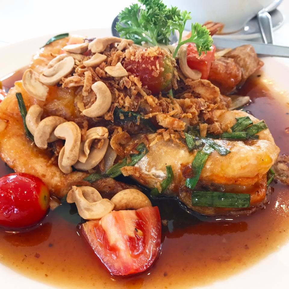 จานที่ 4 เป็นจานเด็ดจานดังของร้านนี้ที่ขอย้ำว่าใครมาทานห้ามพลาดเด็ดขาดเพราะเข้าร้านมาก็จะเห็นผ้าม่านลายเก๋ๆเป็น เจ้ากุ้งซอลมะขามที่ทำให้น้ำลายส่อตั้งแต่ย่างก้าวเข้าร้านมาเลยค่ะ