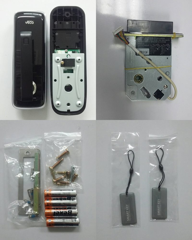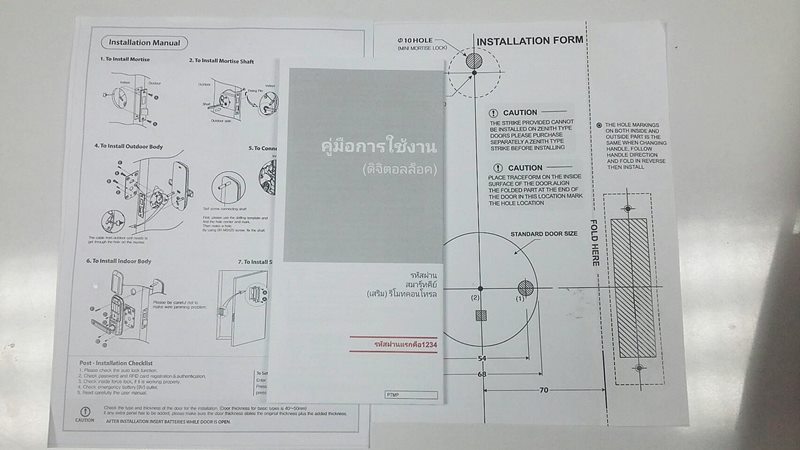 อุปกรณ์ที่มาในกล่องครับ มีตัวดิจิตัลล็อค ที่เป็นแบบมือจับ ด้านหน้า + ด้านหลัง แล้วก็ตลับมอร์ติสที่เป็นเหมือนวงจรหลักครับ มีแบตเตอรี่กับ Smart Key Card ที่ใช้ปลดล็อคมาให้ด้วย