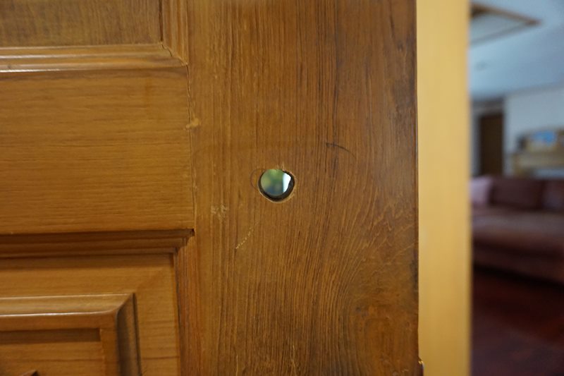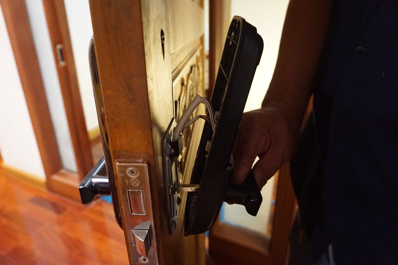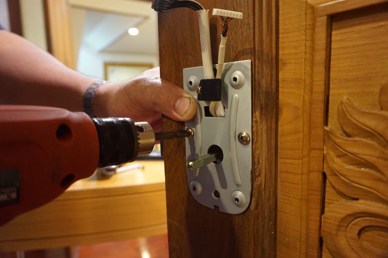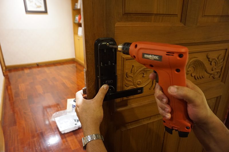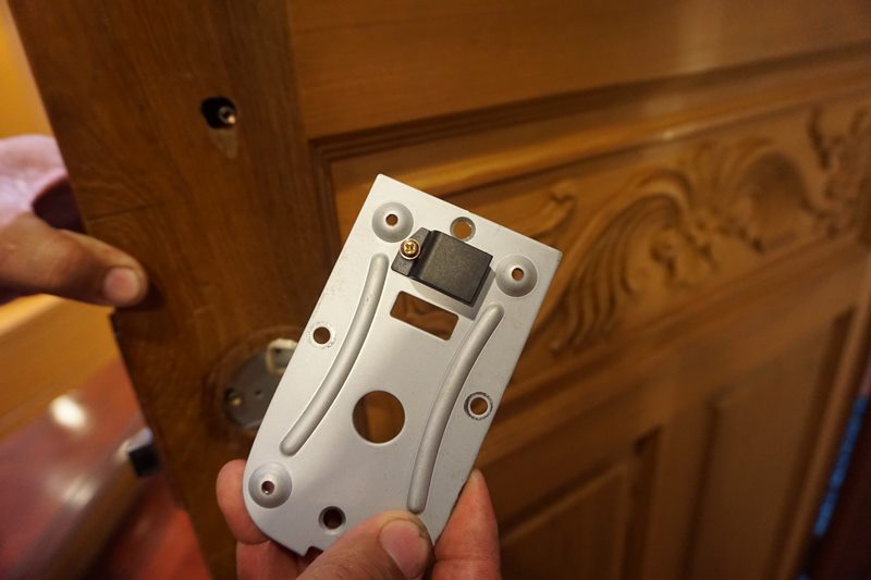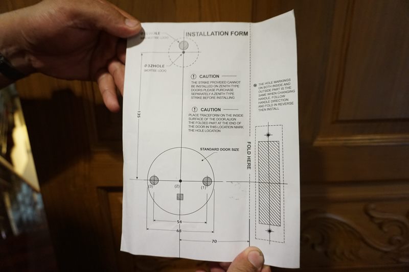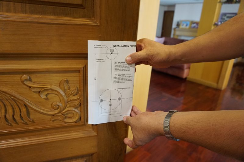 ก่อนอื่นต้องเจาะประตูก่อนครับ เอาลูกบิดออก เค้ามีแบบมาให้ทาบดูด้วยว่าต้องเจาะรูอะไรตรงไหน