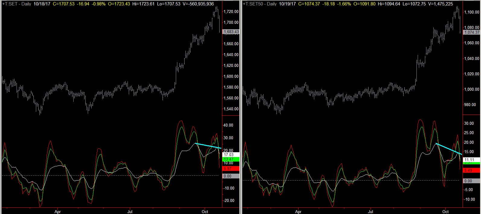 - เส้นขาว < 0 = down trend