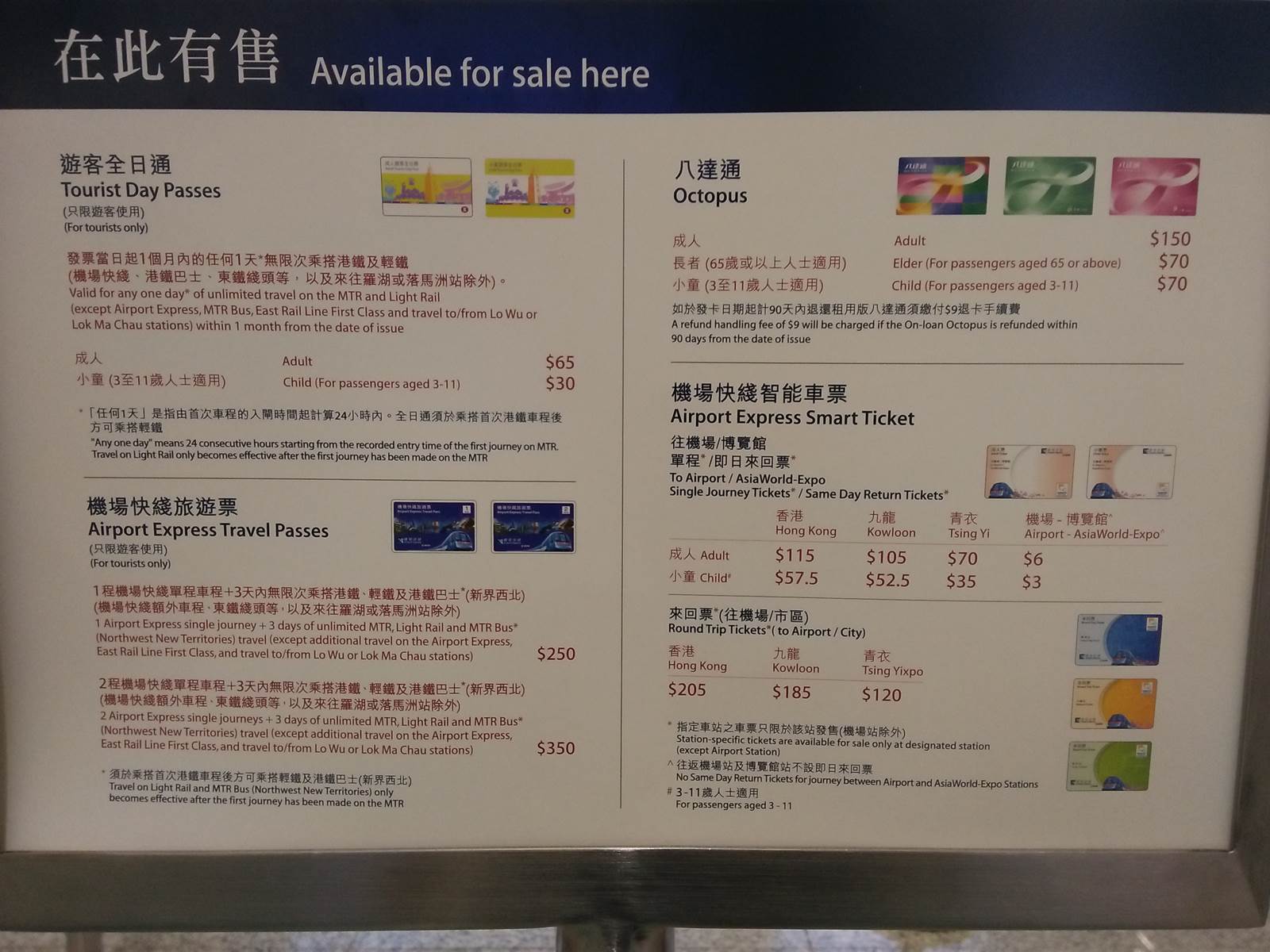 ราคาค่า MTR คร่าวๆ ของคนทั่วไป (ส่วนราคาของเด็ก ผู้สูงอายุ และคนพิการจะเป็นอีกราคาตามชนิดบัตร Octopus ที่ซื้อมาตอนแรก) จากสถานี Tung Chung ไปสถานีอื่นๆ ซึ่งเป็นจุดสำคัญที่นักท่องเที่ยวมักไปไปพักกัน (ราคาและเวลาอ้างอิงจากแอป MTR)