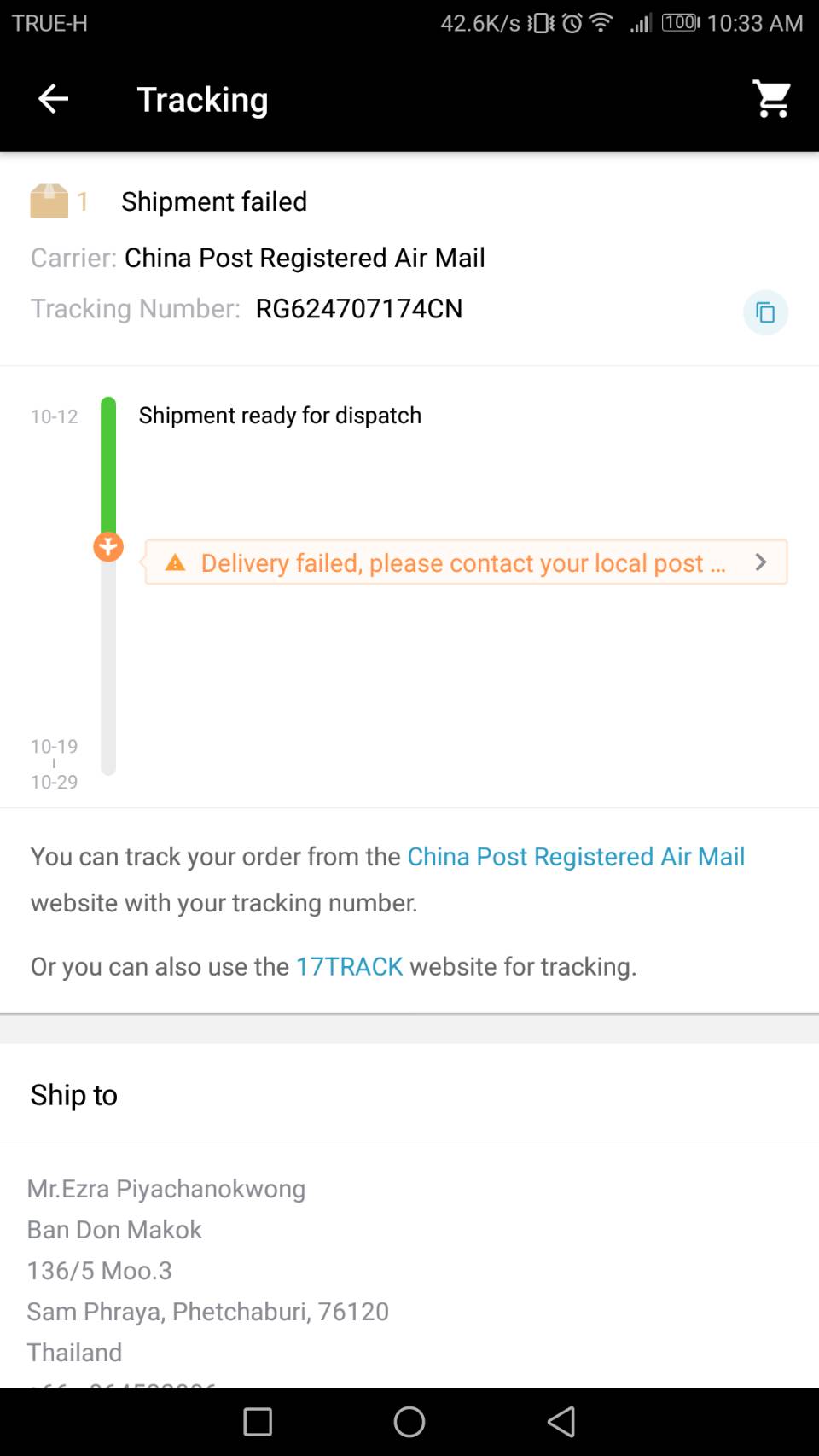 เมื่อวันที่ 8 เดือน ตุลาคม 2560 เวลา 13:21 น. ผมได้สั่งของจากแอพพลิเคชั่น Aliexpress มา ซึ่งสินค้ามาจากประเทศจีน และในวันที่ 16 เดือนตุลาคม สินค้าได้มาถึงประเทศไทย แต่ ! สินค้าทำการส่งผิดที่ ซึ่ง ทั้งๆที่ ได้ระบุที่อยู่ไว้อย่างชัดเจนแล้ว ผมอยู่ที่เพชรบุรี แต่พัสดุ ไปส่งที่ระยอง ยังดีที่ไปส่งแล้วปิดบ้าน ติดต่อก็ยากเหลือเกิน โทรไปไม่เคยรับ สายไม่เคยว่าง เฟสบุ๊คก็ไม่ตอบ