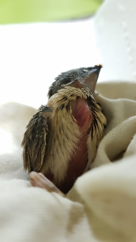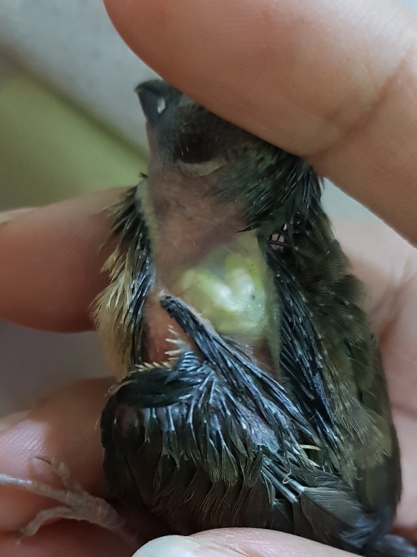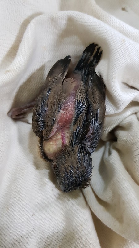 เรารดน้ำต้นไม้อยู่ค่ะ แล้วเห็นอะไรเล็กๆ ดิ้นๆ อยู่บนพื้น เดินไปดูพบว่าเป็นลูกนก (ตามในรูป) มีรอยแดงตรงช่วงอก และมีก้อนขาวๆ อยู่ด้วยตรงคอด้านข้างทั้งสองฝั่ง (ความรู้สึกเราเหมือนก้อนเนื้องอก มีก้อนเล็กๆ สีขาวอยู่ข้างใน คล้ายเม็ดข้าวปลายหักๆ)