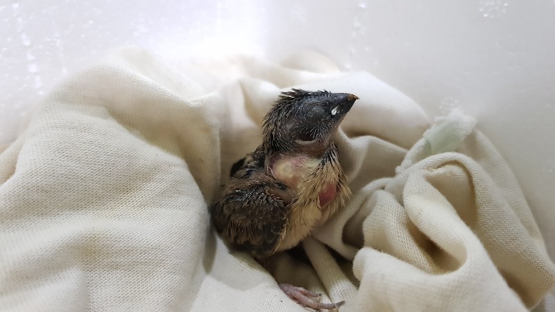 สงสาร แต่ไม่รู้จะทำยังไงดี ตอนนี้เอามานอนบนผ้าในกล่อง หายใจนะคะ แต่ไม่ลืมตา ตอนมีเสียงดังก็สะดุ้งตอบสนอง แล้วกลับไปหลับตาเหมือนเดิม