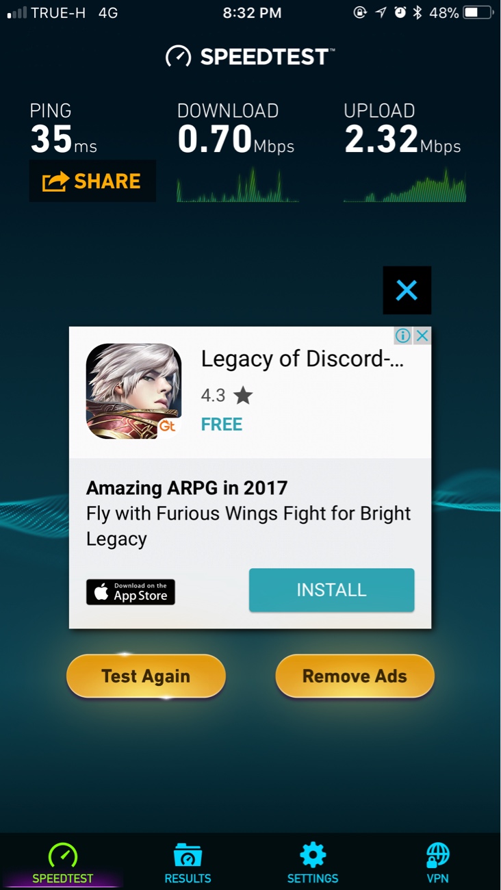 สัญญาณก็มีแค่ขีดเดียว แถม ความเร็วที่ได้ก็ตามนี้เลยอะครับ ขนาดเล่นแค่ ig ก็ยังหมุนเป็นเต่า (ไม่ได้ติด fub แต่อย่างใด)