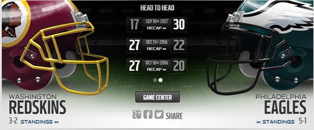 วันนี้เป็นเกมน่าสนใจมากอีกเกมหนึ่ง (3-2) Redskins and Eagles (5-1)