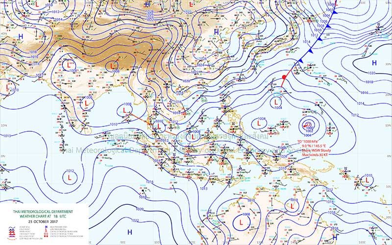 ลักษณะสำคัญทางอุตุนิยมวิทยา บริเวณความกดอากาศสูงกำลังค่อนข้างแรงจากประเทศจีนได้แผ่ลงมาปกคลุมประเทศเวียดนาม และภาคตะวันออกเฉียงเหนือของประเทศไทยแล้ว คาดว่าจะแผ่ปกคลุมภาคเหนือ ภาคกลาง และภาคตะวันออกในวันนี้ (24 ต.ค.60) ทำให้ภาคเหนือ ภาคกลาง และภาคตะวันออกยังคงมีฝนฟ้าคะนองบางแห่ง หลังจากนั้นอุณหภูมิจะลดลง 1-3 องศาเซลเซียส ในภาคตะวันออกเฉียงเหนือและภาคเหนือ